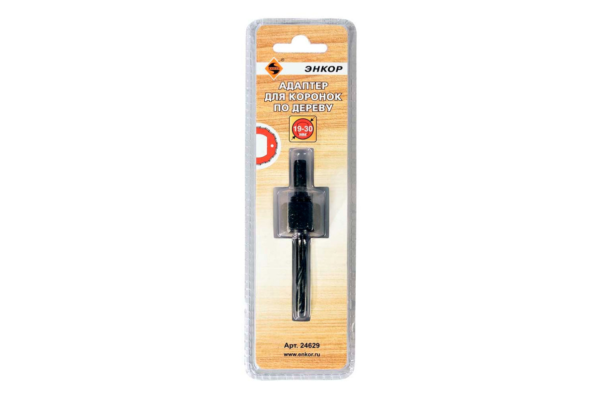 Адаптер Энкор 24629 используется совместно с коронками по дереву диаметром от 19 до 30 мм. С помощью приспособления коронка надежно фиксируется в патроне дрели. Адаптер имеет шестигранный хвостовик 1/4".