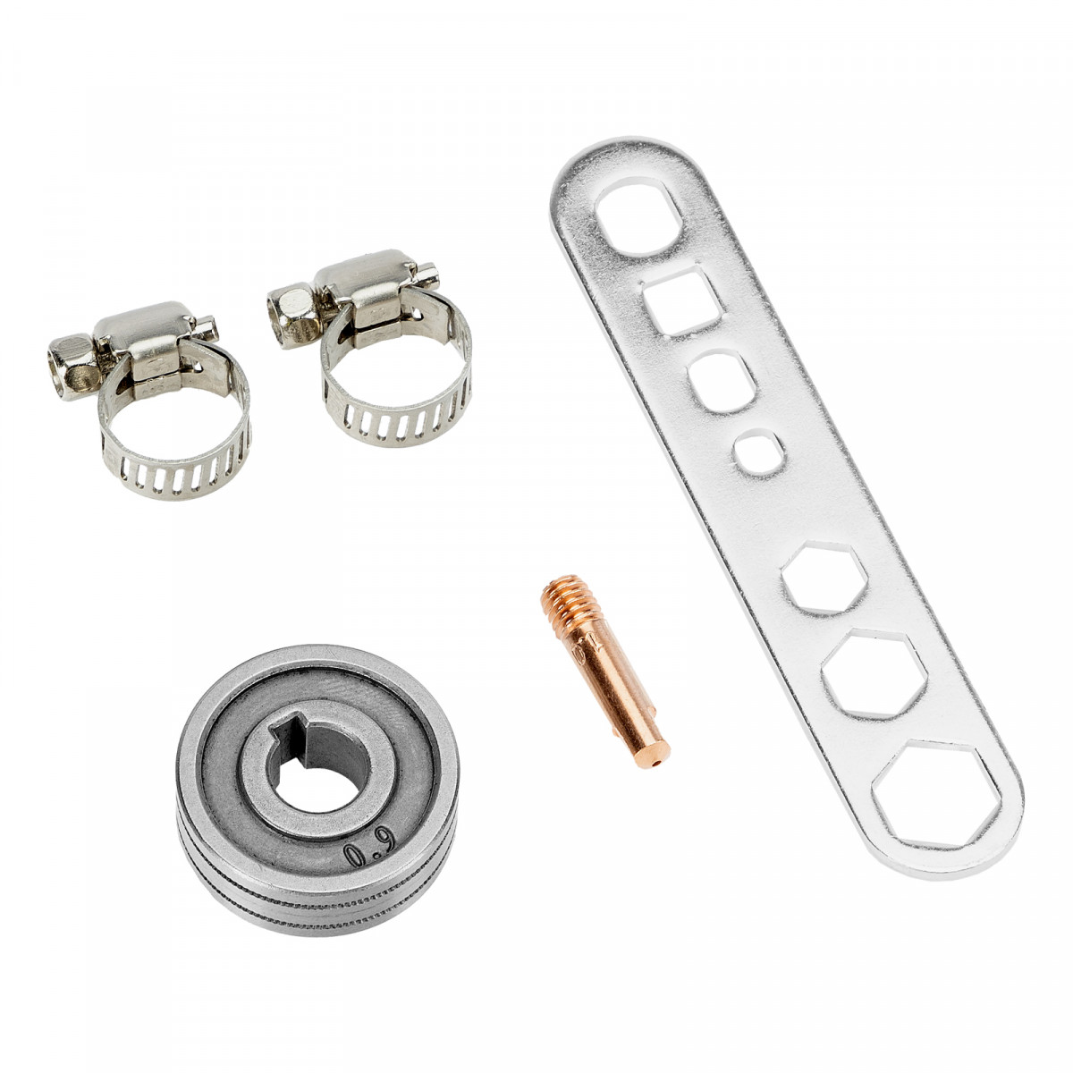 - Продуманная комплектация — аппарат поставляется с горелкой MIG, газовым шлангом и сварочными проводами (с электрододержателем и зажимом «земля»).
