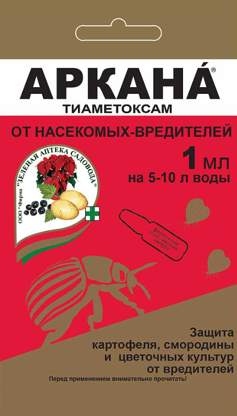 Комплексная защита почвенно-наземного применения.АРКАНА отлично работает влюбых условиях - высокая, низкая температура, не смывается дождем эффект "Жизненой силы" - АРКАНА повышает активность специфических белков в растениях, увеличивается масса корней, быстрее развивается листовой аппарат растения более высокие и зеленые, улучшается качество урожая эдостаточно одной обработки. Применяют для защиты культур от комплекса сосущих и листогрызущих насекомых против колорадского жука на картофеле, от тли на смородине, от тли, белокрылки, щитовки и ложнощитовки,
