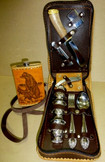 В комплект входит:стопки 3шт посеребрянные.,зажигалка,ложки 3шт.,вилки 3шт.,нож складной,нож охотничий,открывалка многофункциональная,фляжка.