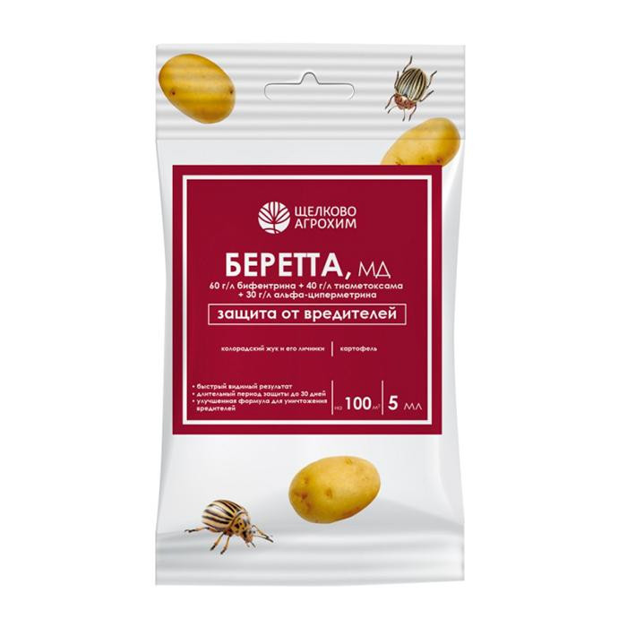 Инсектицид «Беретта, МД» – один из самых современных и эффективных препаратов от колорадского жука. Препарат эффективно воздействует на все стадии развития насекомых, включая обитающих на обратной стороне листа и скрытноживущих. В составе препарата три действующих вещества, каждое из которых за счёт различия свойств действует на вредителей по-своему: если вредитель устоит против одного компонента, то гибель наступит от двух других. После обработки раствор легко проникает внутрь растения и отлично закрепляется на теле насекомого, усиливая контактное действие. «Беретта, МД» устойчив к смыванию осадками и испарению с обработанной поверхности. Всё это обеспечивает длительный период защиты картофельных посадок – до 35 дней.