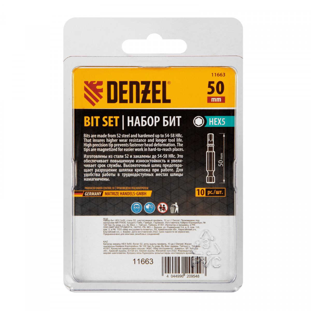 Бита HEX 5х50, сталь S2, шестигранный профиль, 10 шт. Е 6,3 Denzel