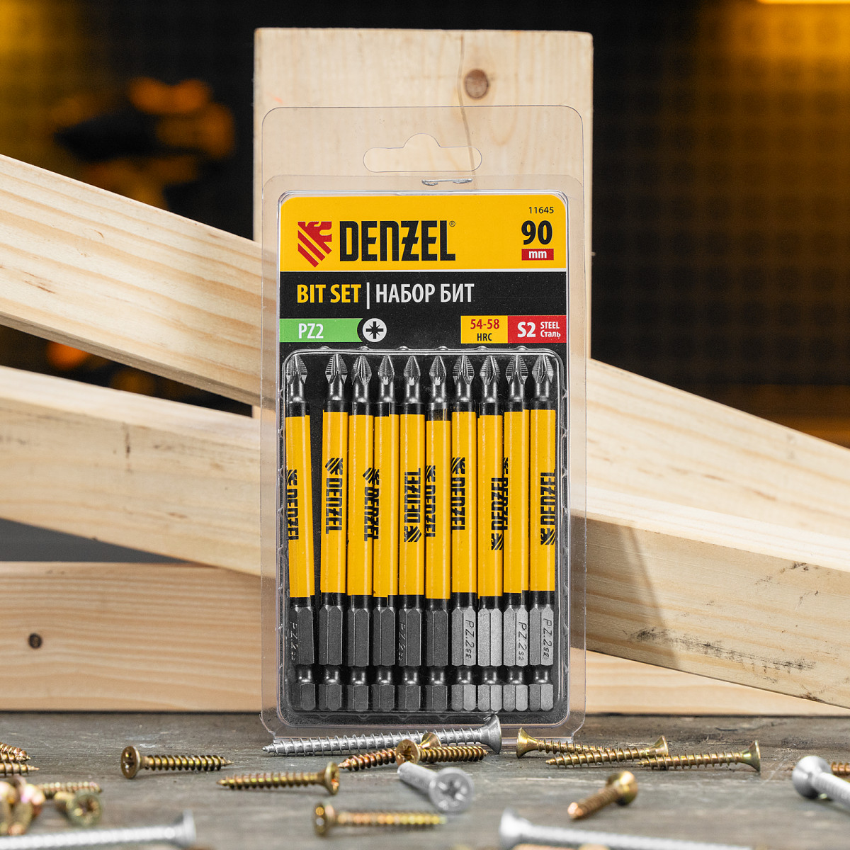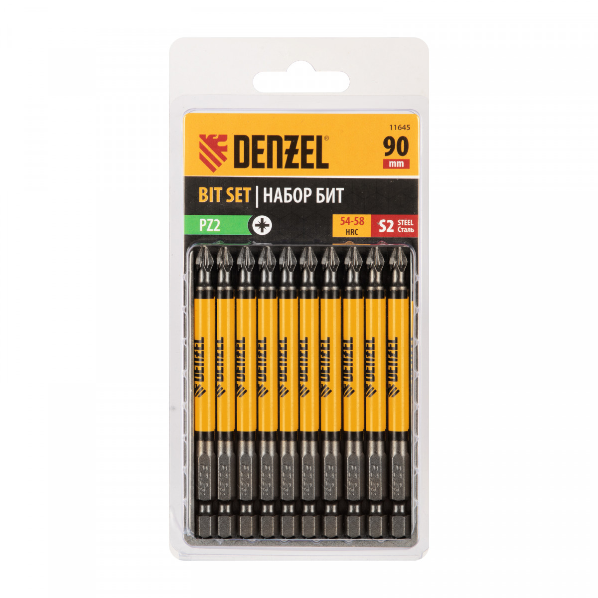 Набор односторонних бит PZ x 90 мм Denzel 11645 включает в себя 10 сменных насадок из стали S2 с крестообразными шлицами Pozidriv и шестигранными хвостовиками 1/4". Профессиональная оснастка рассчитана на работу с шуруповертом, обеспечивает быстрый монтаж и демонтаж резьбовых соединений с углублением PZ2. Устойчивое сцепление с крепежом благодаря дополнительным ребрам на шлице Позидрайв позволяет увеличить крутящий момент и снизить риск соскакивания биты.