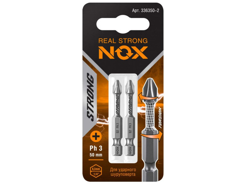 Торсионная бита NOX STRONG – профессиональная бита c повышенным ресурсом и износостойкостью. Предназначена для использования с электроинструментом в ударном режиме.Тип шлица PH2, длина 25 мм.Изготовлены из легированной стали марки S2, обладающей повышенной прочностью и износостойкостью за счёт пружинных свойств. Твёрдость стали по шкале Роквелла 58-62 HRC.Шестигранный хвостовик ¼ HEX исключает проскальзывание оснастки в патроне электроинструмента.Биты NOX изготовлены методом фрезеровки , что обеспечивает точность формы биты в соответствии со стандартом DIN и гарантирует высокий ресурс биты.Подходит для работы электродрелью со стандартным трёхкулачковым зажимным патроном и шуруповёртом с шестигранным патроном для быстрой смены насадки.