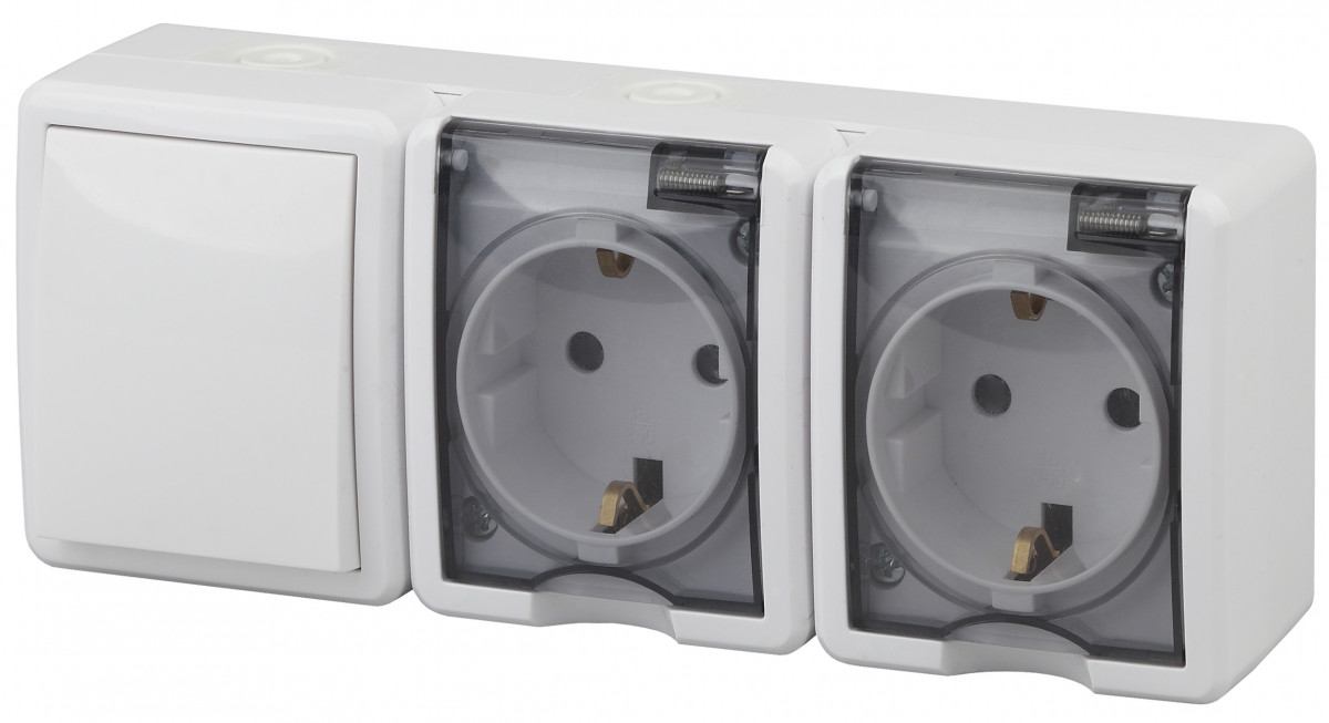 Блок ЭРА две розетки+выключатель IP54 16A(10AX)-250В ОУ Эра Эксперт белый 11-7403-01