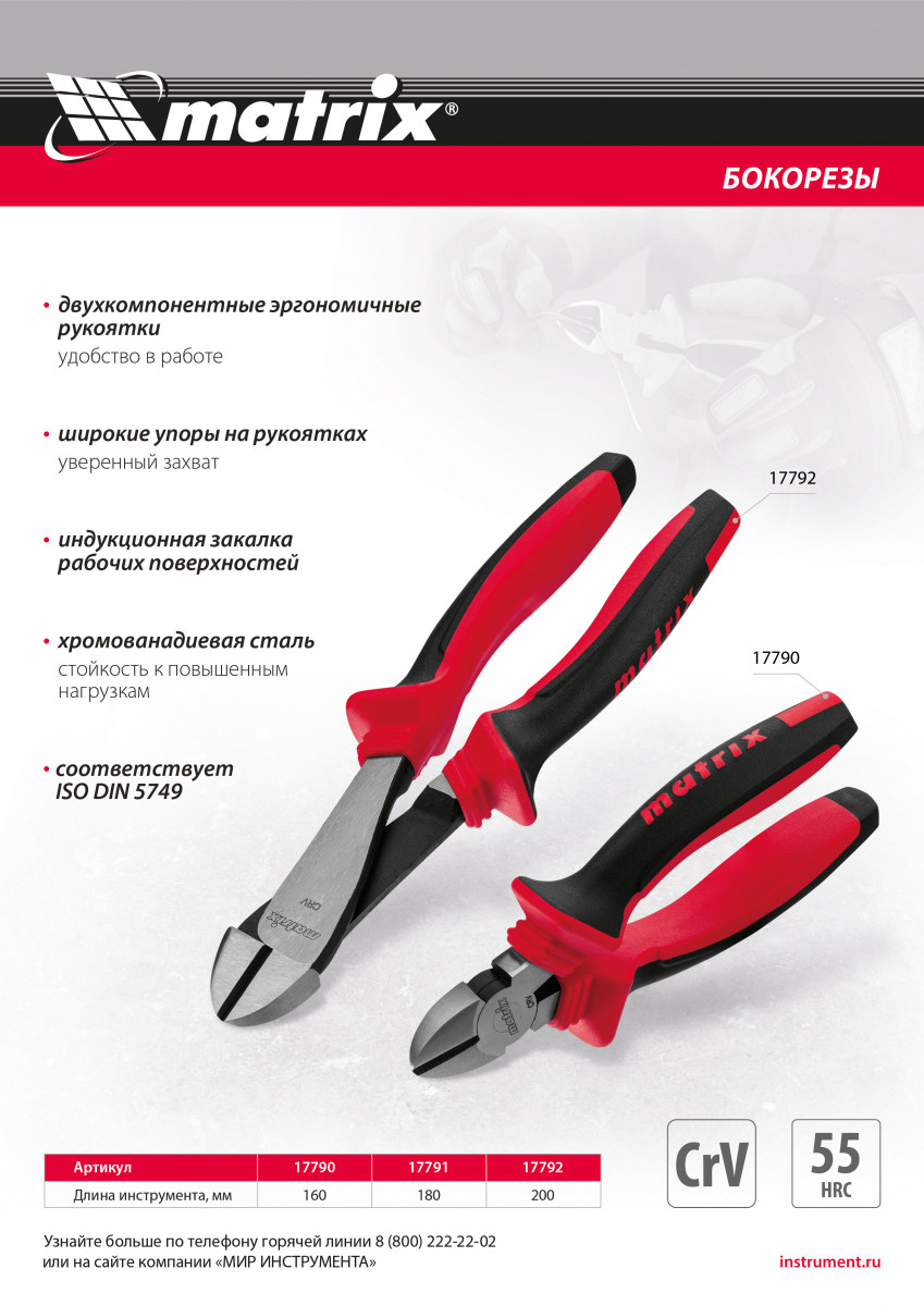 Бокорезы Matrix 17791 длиной 180 мм, из хромованадиевой стали, с двухкомпонентными рукоятками, предназначены для выполнения слесарных и ремонтно-монтажных работ: разрезания проводов, кабелей, стальной проволоки и гвоздей диаметром до 1,6 мм. Пригодятся в частной мастерской или на строительной площадке, будут полезны не только начинающему мастеру, но и профессионалу.