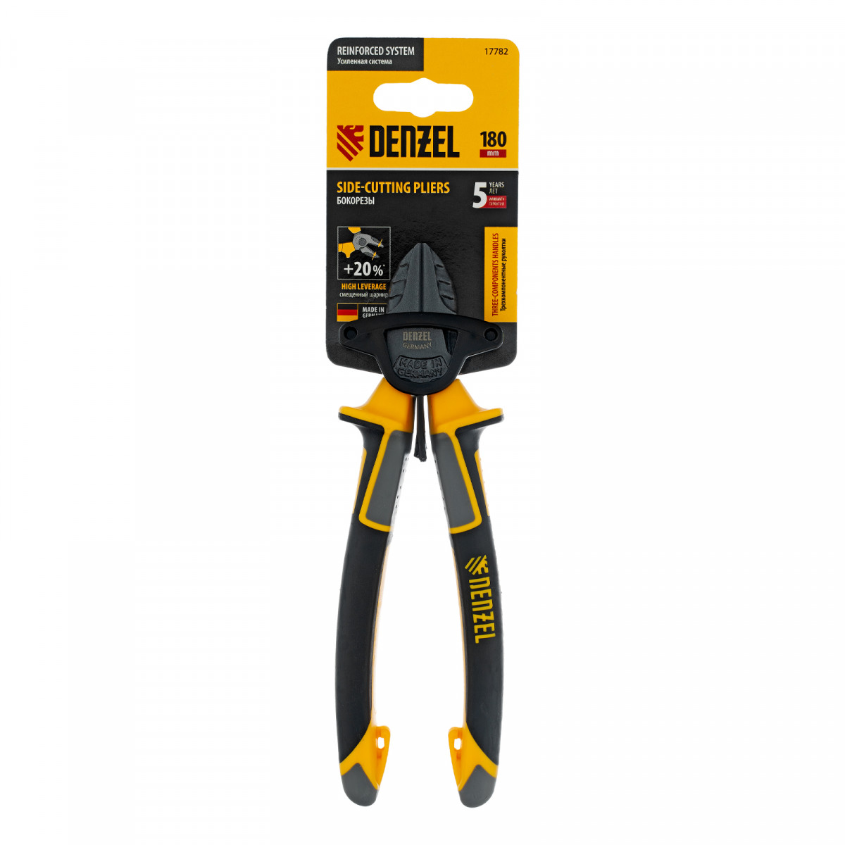 Бокорезы Denzel 17782 длиной 180 мм, с трехкомпонентными рукоятками, предназначены для разрезания кабелей из алюминия и меди, а также проволоки и стяжек. Максимальный диаметр перерезаемой мягкой проволоки (алюминиевой, медной, с пределом прочности 220 Н/мм2) составляет 7 мм, проволоки средней жесткости и гвоздей (750 Н/мм2) — 4 мм, жесткой (1800 Н/мм2) — 2,5 мм. Бокорезы используются для проведения слесарных и монтажных работ. Шарнир смещен к режущим кромкам, что позволяет сэкономить 20% усилий и максимально эффективно решать поставленные задачи.