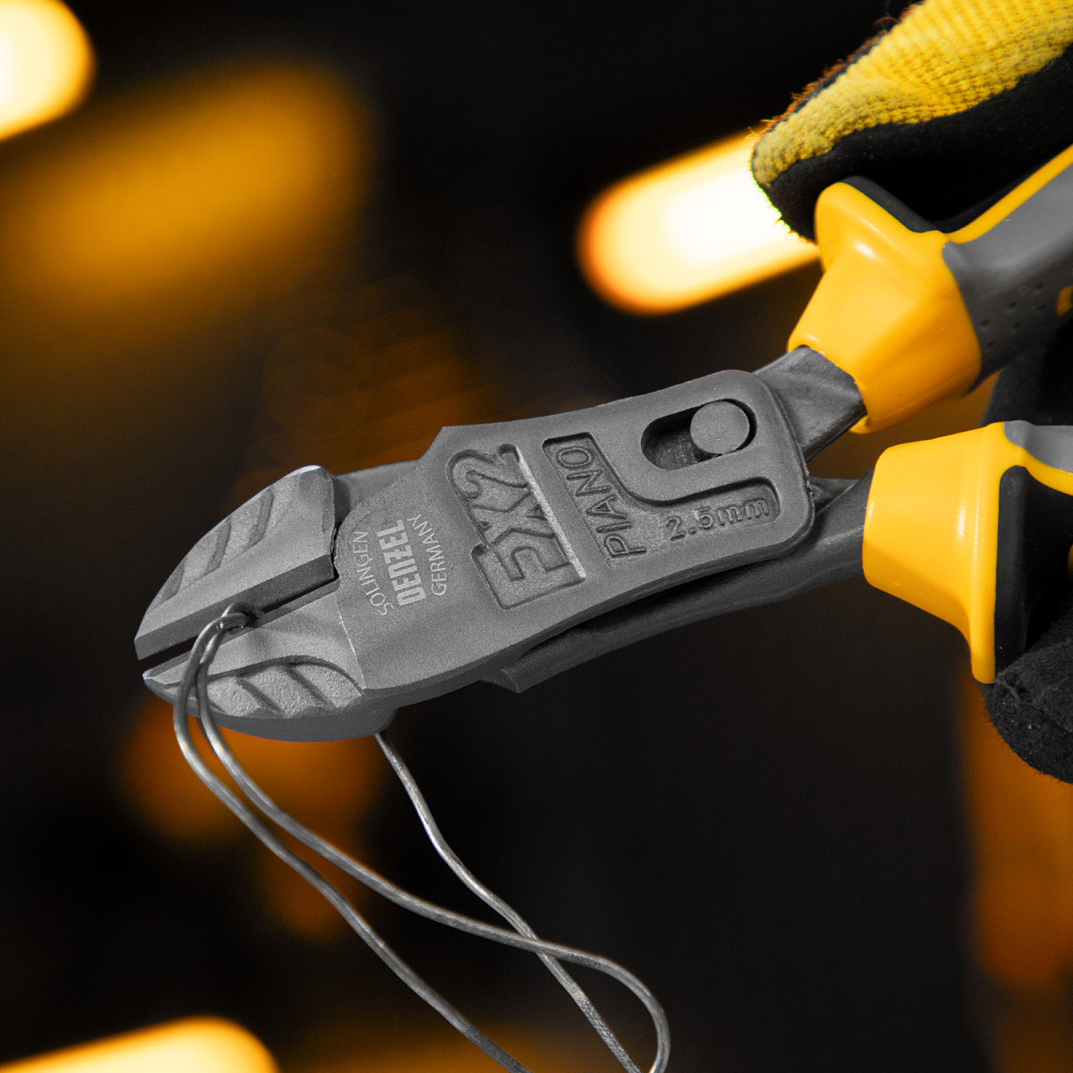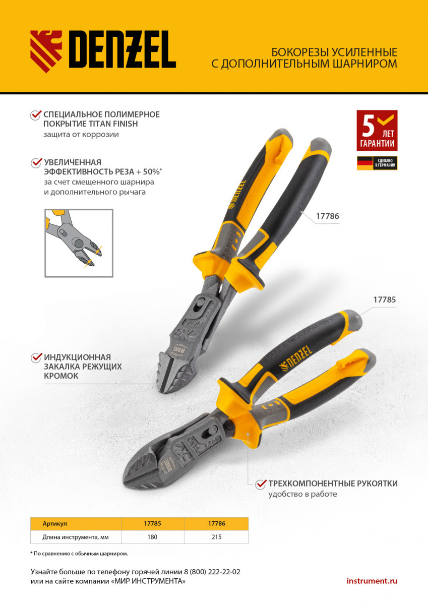Усиленные бокорезы Denzel 17785 длиной 180 мм, с трехкомпонентными рукоятками, предназначены для разрезания кабелей, проводов, гвоздей и проволоки средней (750 Н/мм2) и высокой жесткости (1800 Н/мм2) диаметром 4 и 2,8 мм соответственно. Подходят для резки рояльных струн (предел прочности 2300 Н/мм2) диаметром до 2,5 мм. Успешно справляются не только с медными, алюминиевыми и пластмассовыми деталями, но и с более жесткими стальными элементами. Встроенный рычажный механизм и смещенный непосредственно к режущим кромкам шарнир увеличивают усилие реза на 50%.