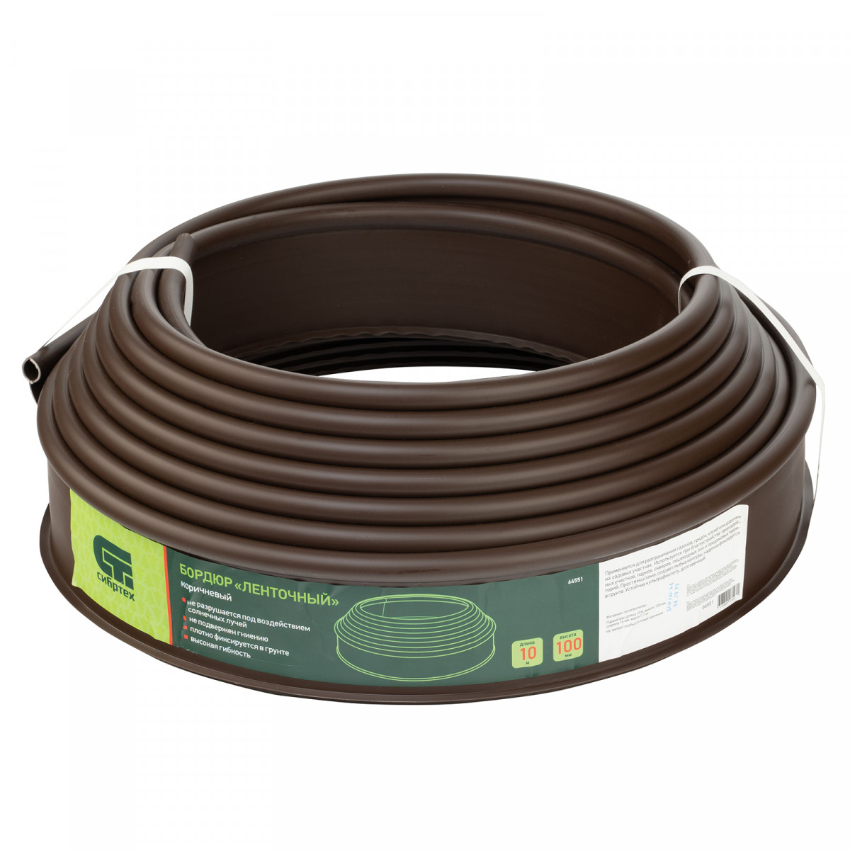 Полиэтиленовый бордюр Сибртех «Лента» 64551 размером 10 х 1000 см, коричневого цвета, предназначен для оформления отдельных участков озелененных территорий. Гибкому ограждению можно придать любую форму, что позволяет подчеркнуть контуры цветников и грядок, защитить грунтовые дорожки от размывания, обозначить границы приствольных кругов деревьев.