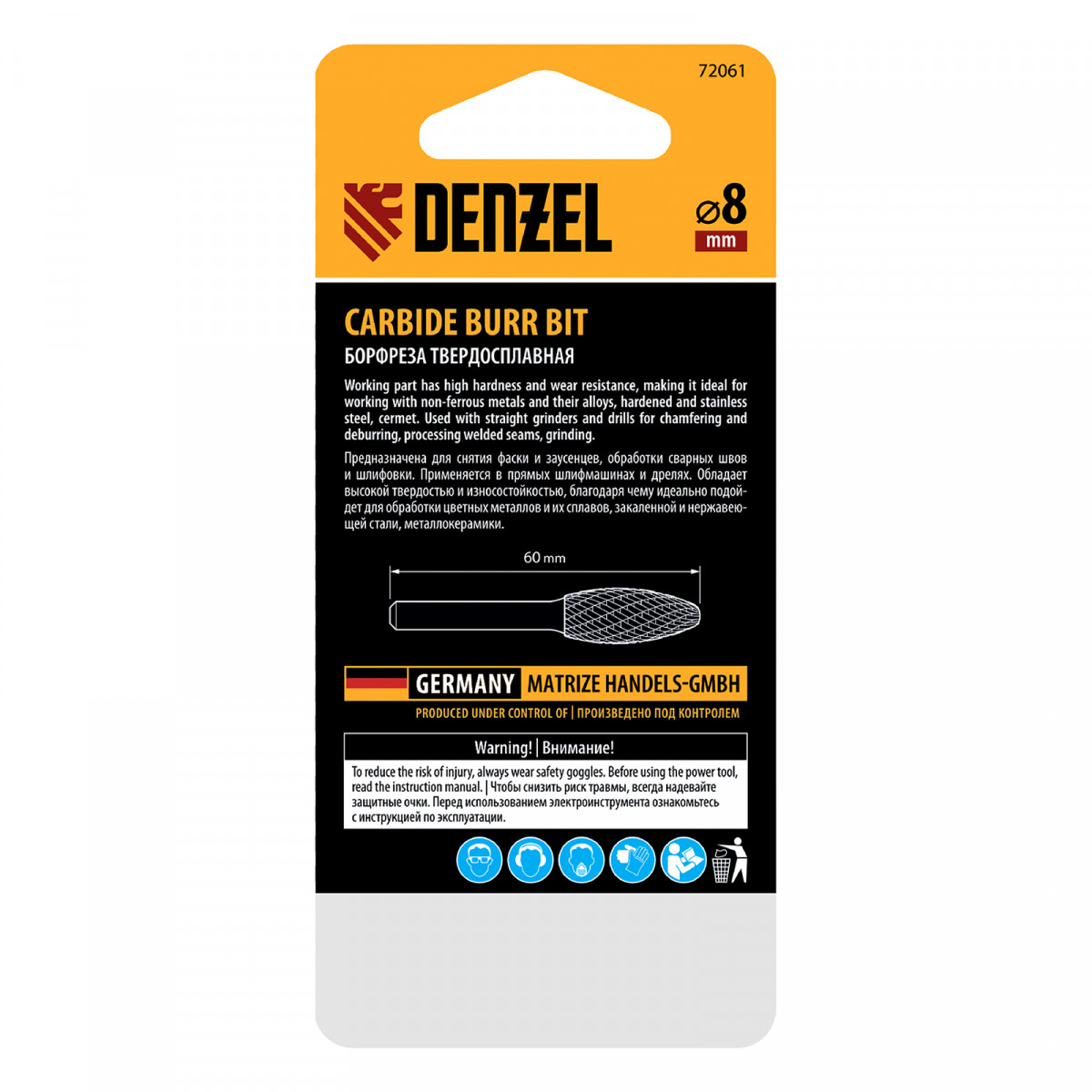 Твердосплавная борфреза Denzel 72061 с эллипсообразной рабочей частью (тип H), диаметром 8 мм, — оснастка для дрели и прямошлифовальной машины, предназначенная для выполнения работ по металлу. Эффективно обрабатывает нержавеющую и закаленную сталь, чугун, титан, бронзу, медь, латунь, а также металлокерамику и искусственный камень. Пламевидная режущая часть удобна для шлифовки деталей сложной формы. Борфреза подходит также для восстановления гравировки.