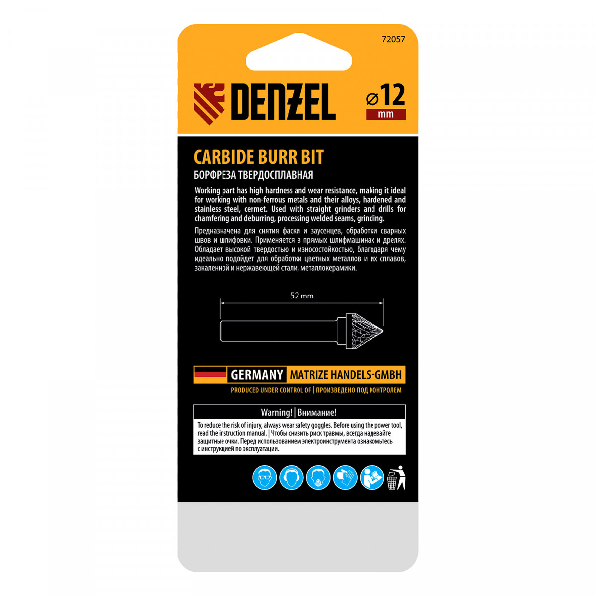Твердосплавная борфреза по металлу Denzel 72057 с рабочей частью-зенкером с вершиной 60° (тип J), диаметром 12 мм, устанавливается на дрель или прямошлифовальную машину. Используется для обработки закаленной и нержавеющей стали, латуни, бронзы, меди, чугуна, титана, а также металлокерамики и искусственного камня. Оптимальна для снятия фасок и заусенцев, обработки кромок, угловых пазов, краев отверстий.