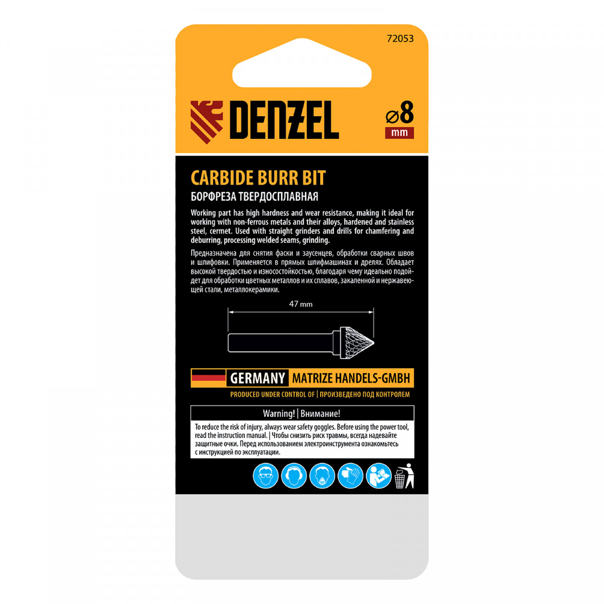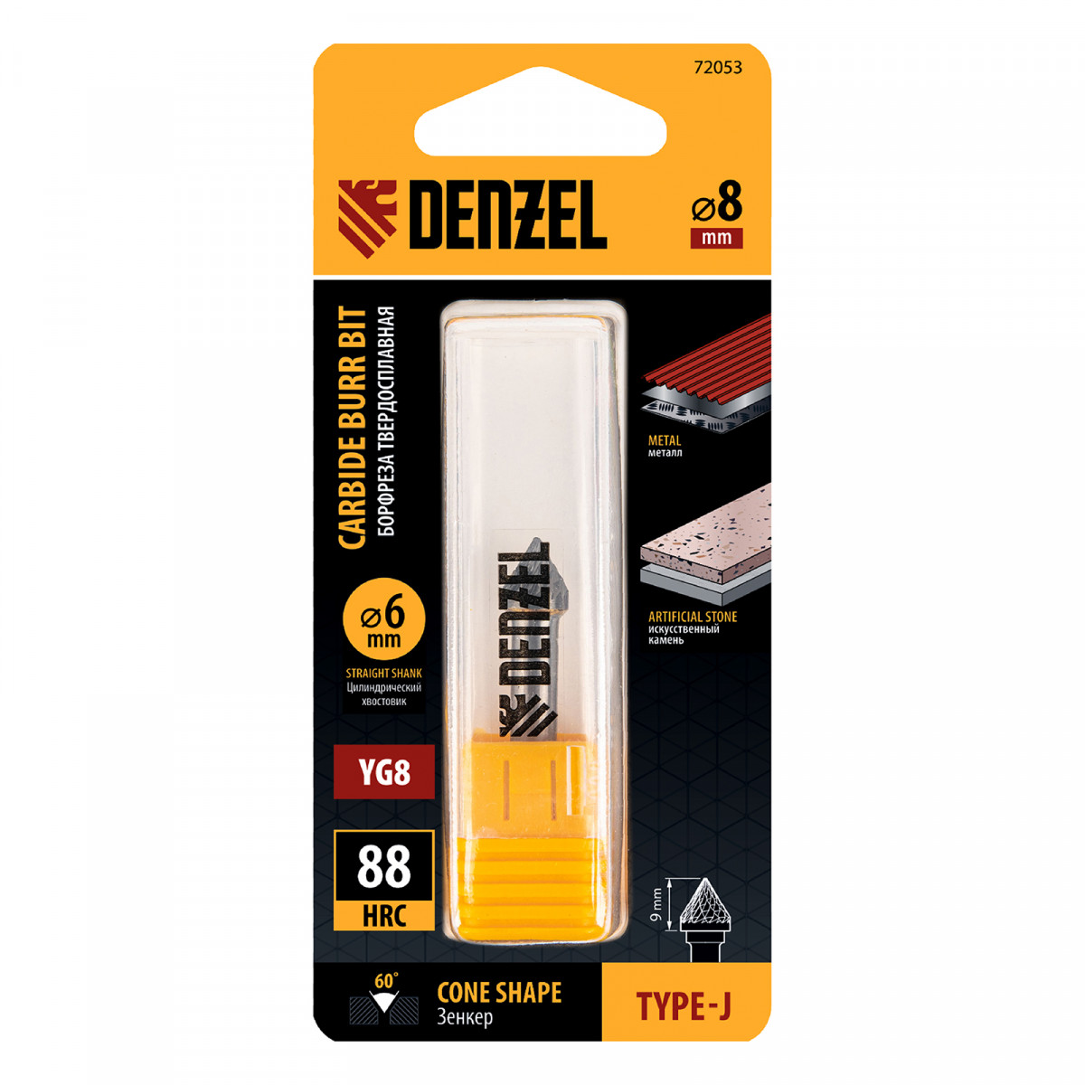 Твердосплавная борфреза по металлу Denzel 72053 с рабочей частью-зенкером с вершиной 60° (тип J), диаметром 8 мм, устанавливается на дрель или прямошлифовальную машину. Используется для обработки закаленной и нержавеющей стали, латуни, бронзы, меди, чугуна, титана, а также металлокерамики и искусственного камня. Оптимальна для снятия фасок и заусенцев, обработки кромок, угловых пазов, краев отверстий.