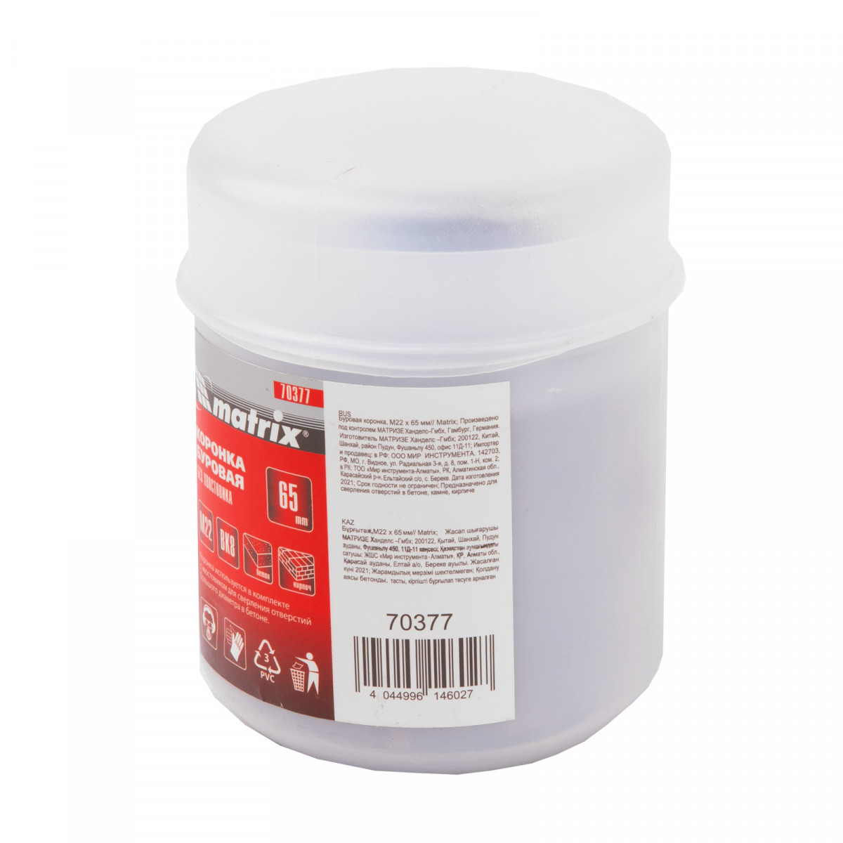 Буровая коронка M22 х 65 мм Matrix 70377 рассчитана на сверление отверстий в бетоне, кирпиче, граните, природном и искусственном камне. Устанавливается на ударные дрели или перфораторы с патронами под хвостовик SDS-Plus или SDS-Max. Коронка позволяет получить большие отверстия, поэтому пригодится для монтажа розеток, выключателей и прокладки труб.