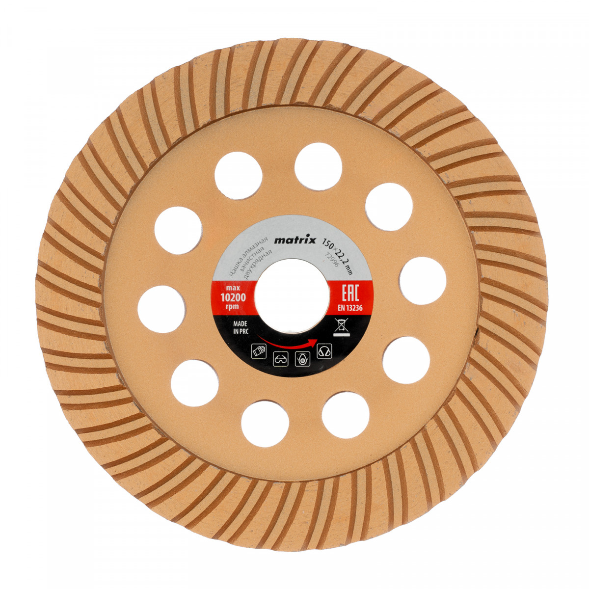 Алмазная зачистная чашка Matrix Turbo 72997 диаметром 150 мм устанавливается на вал углошлифовальной машины, для чего предусмотрено посадочное отверстие 22,2 мм. Используется для придания окончательной гладкости бетонным, каменным, мраморным, гранитным и кирпичным поверхностям, а также для снятия фаски на плитах из гранита или мрамора. Предназначена для профессионального применения.