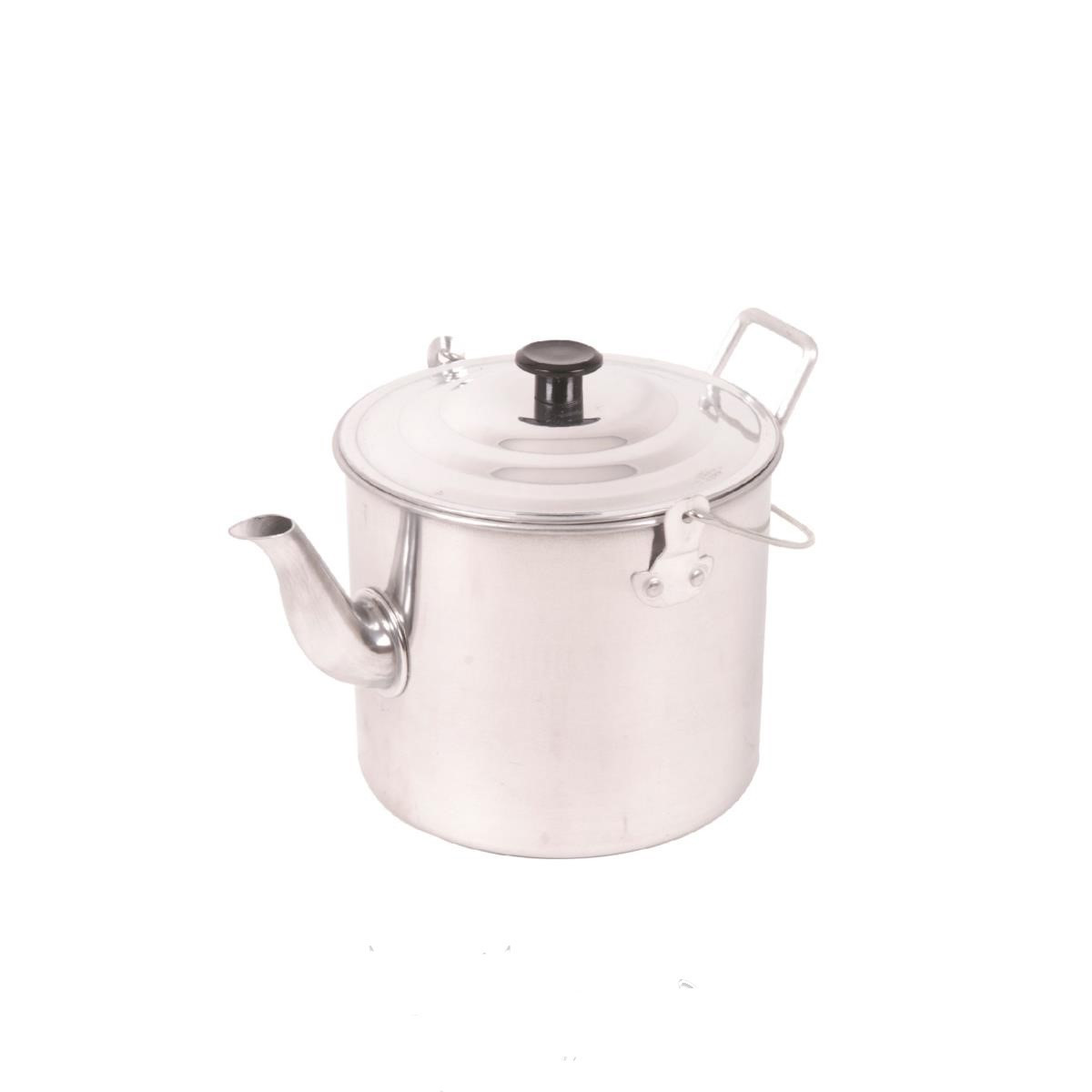 Легкий походный чайник из алюминия с объемом 1,8 л. Вскипяченной за раз воды хватит на 5-6 человек. Чайник имеет удобные складные ручки и правильную форму носика для разливания по чашкам. Рекомендован для использования на костре, а также на плитках и горелках.