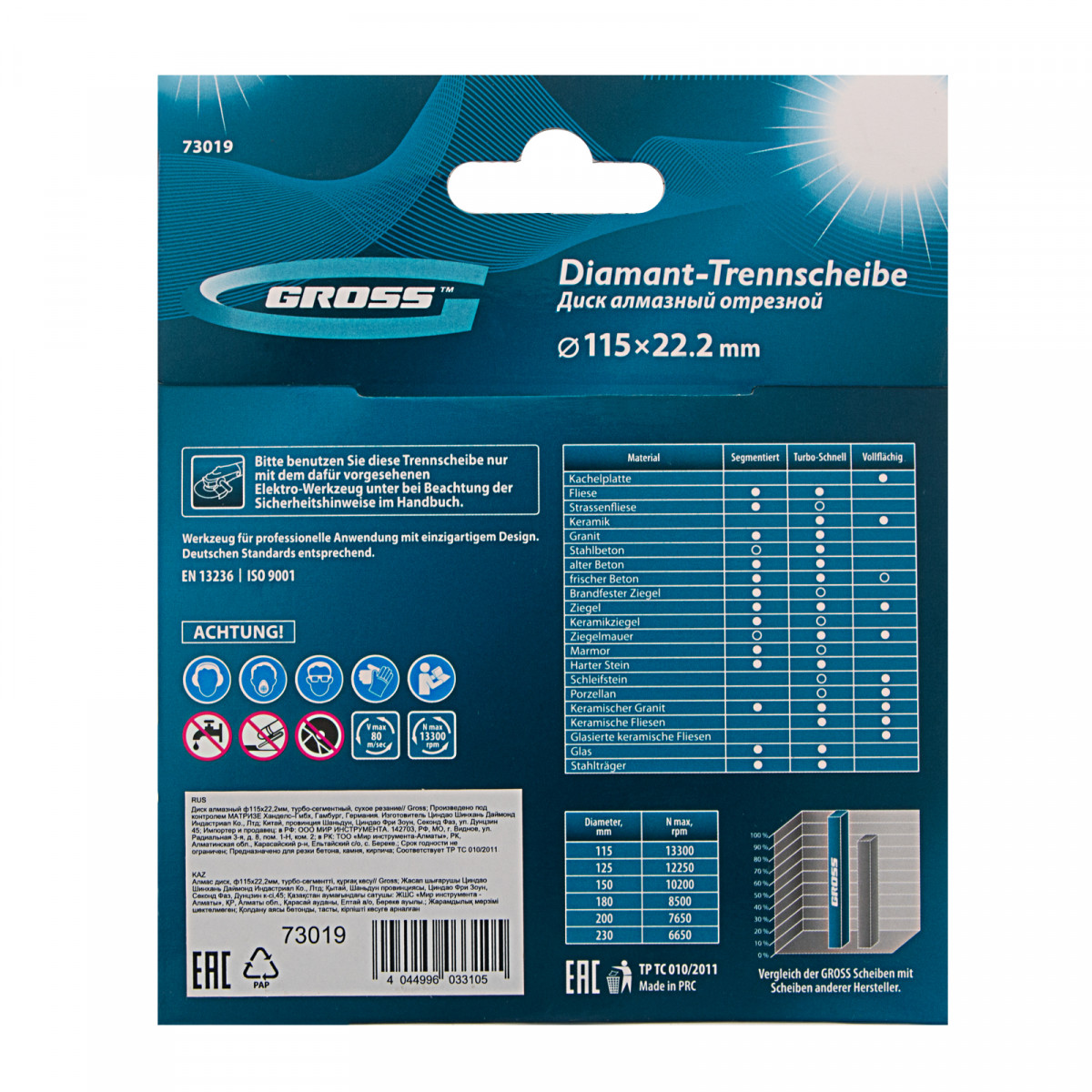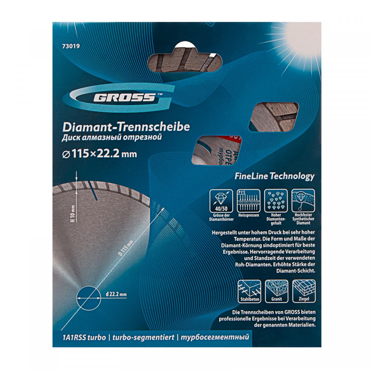 Алмазный турбо-сегментный диск Gross 73019 диаметром 115 х 22,2 мм, для сухой резки, — оснастка для УШМ со скоростью вращения до 13300 об/мин, предназначенная для отрезных работ. Универсальный диск с турбированной рабочей частью можно использовать для резки камня, гранита и кирпича, свежего бетона, а также слабоармированного железобетона. Он подходит для профессионального использования.