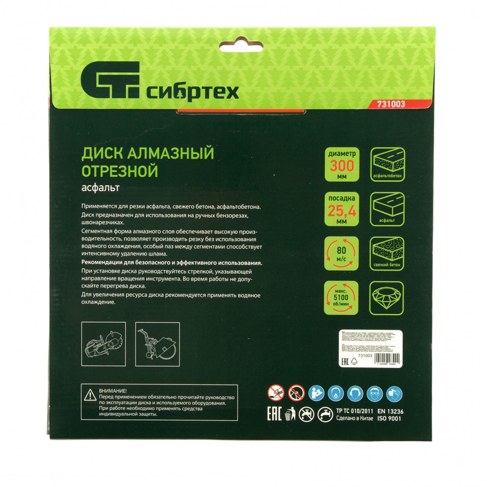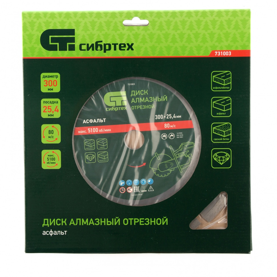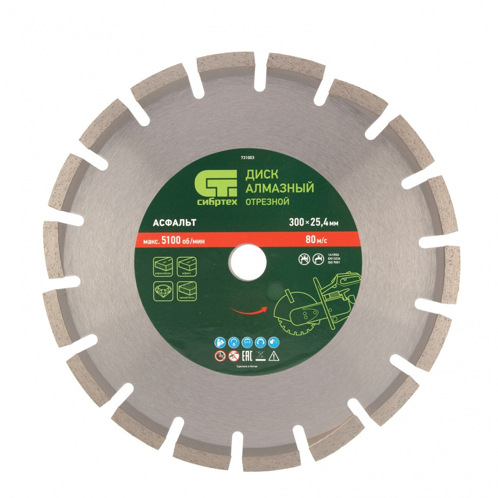 Алмазный диск Сибртех «Асфальт» 731003 диаметром 300 х 25,4 мм используется для сухого и мокрого реза асфальта, свежего бетона, асфальтобетона, камня, кирпича, абразивных материалов. Устанавливается на ручной бензорез или швонарезчик с посадочным диаметром 25,4 мм. Диск устойчив к деформациям и выдерживает значительные нагрузки. Для увеличения ресурса диска рекомендуется проводить мокрое резание.