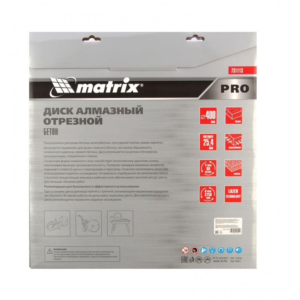 Алмазный диск Matrix PRO «Железобетон» 731113 диаметром 400 х 25,4 мм используется с профессиональными швонарезчиками, ручными бензорезами и специальными станками для сухого и мокрого реза различных материалов. Позволяет работать по тяжелому и армированному бетону, камню, тротуарной плитке, силикатному кирпичу, абразивному песчанику и другим особо твердым материалам. Диск характеризуется высокой производительностью и подходит для интенсивного применения.