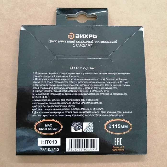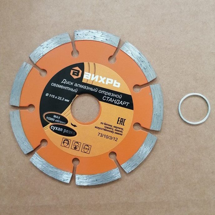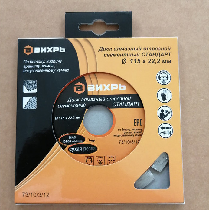 Диск алмазный отрезной сегментный СТАНДАРТ, 115 х 22,2 мм, сухая резка Вихрь - это алмазный отрезной диск, который используется совместно с угловыми шлифмашинами (болгарками) для сухой резки гранитных, бетонных, кирпичных и каменных изделий.