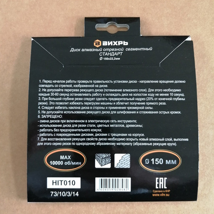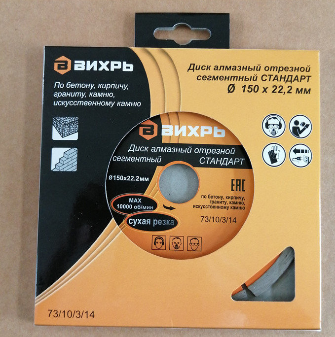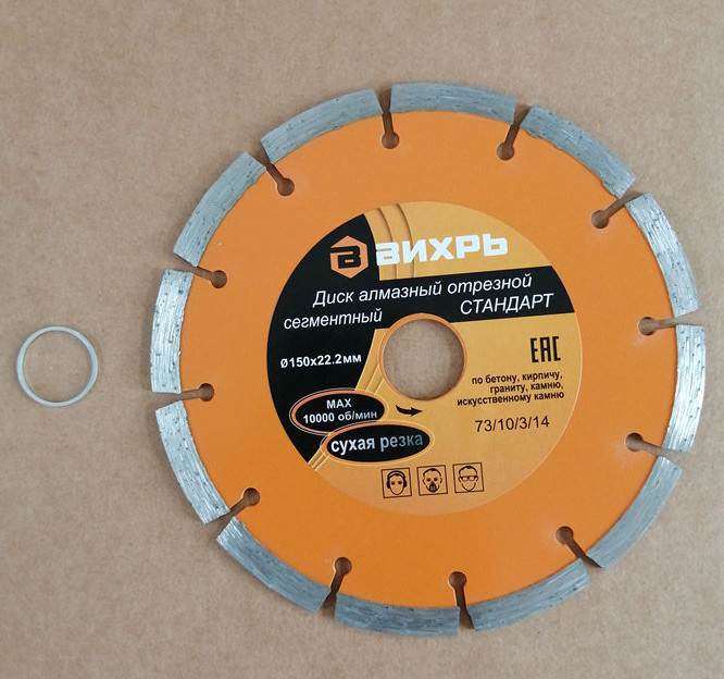 Диск алмазный отрезной сегментный СТАНДАРТ, 150 х 22,2 мм, сухая резка Вихрь - это алмазный отрезной диск, который используется совместно с угловыми шлифмашинами (болгарками) для сухой резки гранитных, бетонных, кирпичных и каменных изделий.
