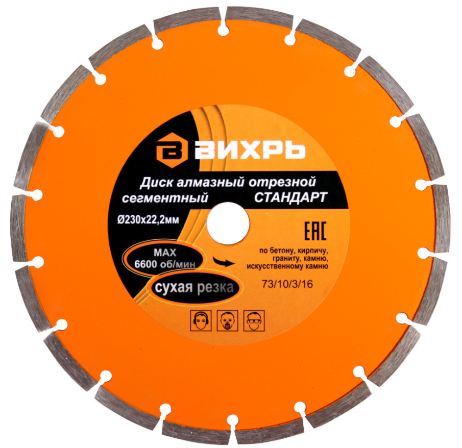 Диск алмазный отрезной сегментный СТАНДАРТ, 230 х 22,2 мм, сухая резка Вихрь - это алмазный отрезной диск, который используется совместно с угловыми шлифмашинами (болгарками) для сухой резки гранитных, бетонных, кирпичных и каменных изделий.