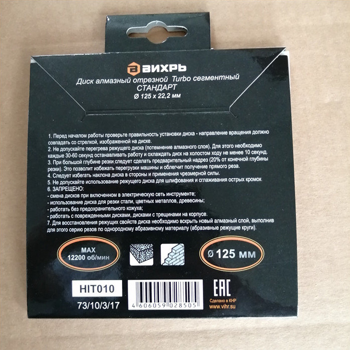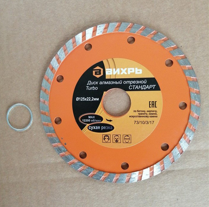 Диск алмазный отрезной Турбо СТАНДАРТ, 125 х 22,2 мм, сухая резка Вихрь - это алмазный отрезной диск, который используется совместно с угловыми шлифмашинами (болгарками) для сухой резки гранитных, бетонных, кирпичных и каменных изделий.