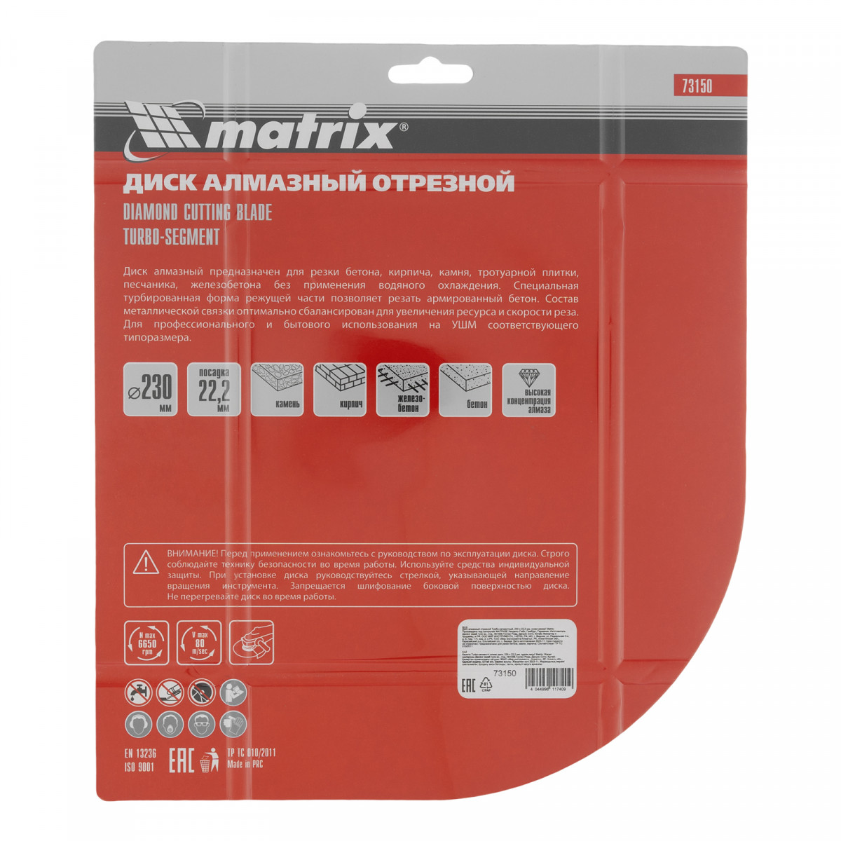 Диск алмазный, отрезной Турбо-сегментный, 230 х 22.2 мм, сухая резка Matrix Professional
