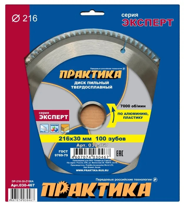 Диск пильный по ламинату ПРАКТИКА 030-467 DP-216-30-Z100 216х100x30мм T=2.2мм, по алюм., ламинату