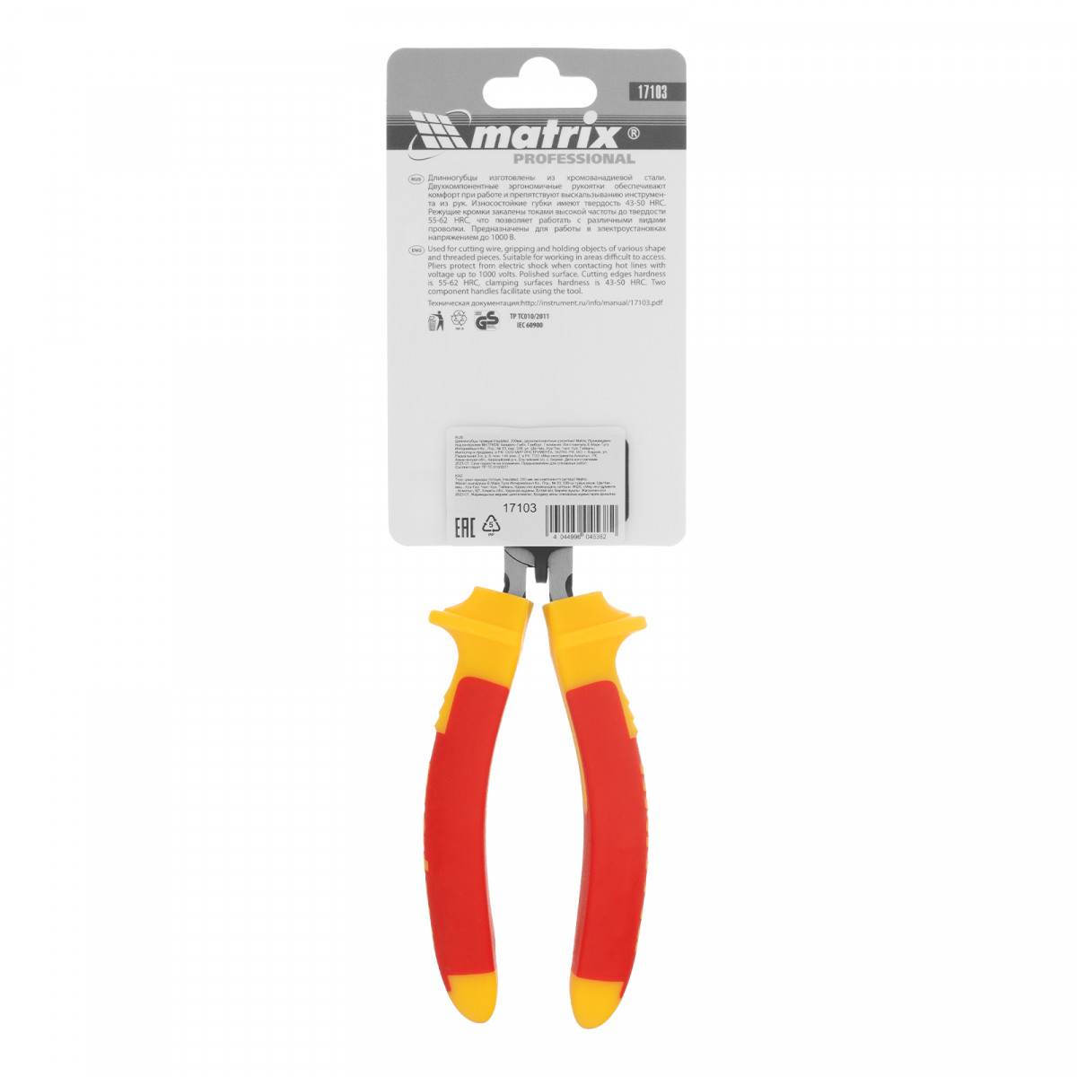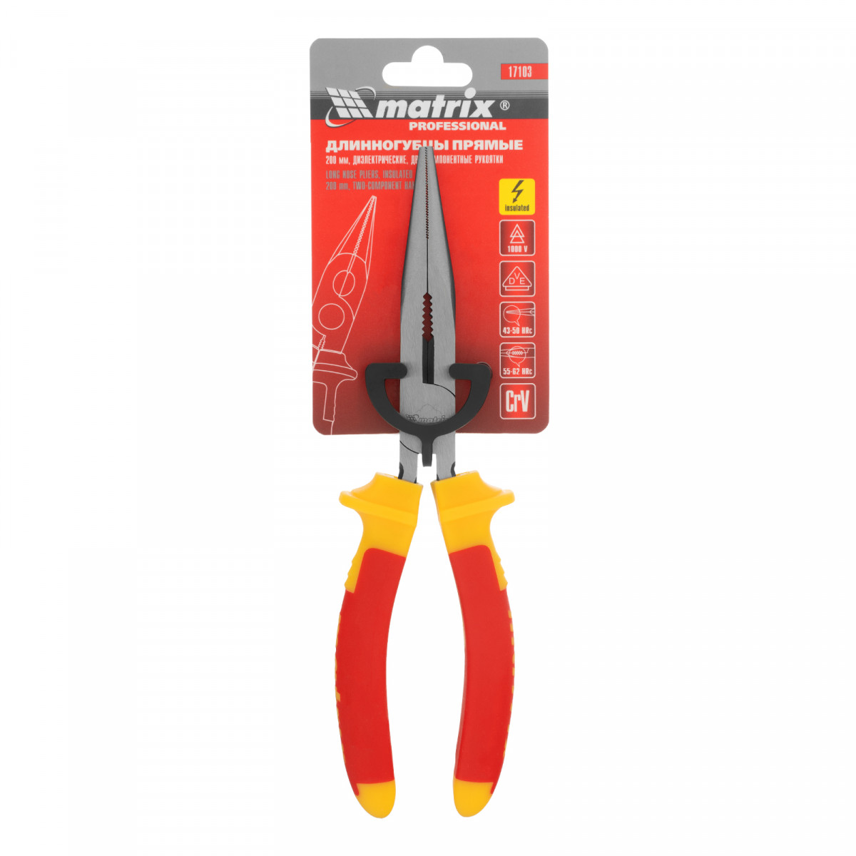Прямые длинногубцы Matrix Insulated 17103 длиной 200 мм, с двухкомпонентными рукоятками, служат для удерживания гвоздей и других мелких деталей, перекусывания проволоки, ремонта мелкой техники и решения других задач. Инструмент удобен для работы в труднодоступных местах и будет полезен домашнему мастеру. Рукоятки обладают диэлектрическими свойствами до 1000 В, однако техника безопасности запрещает проводить работы под напряжением!