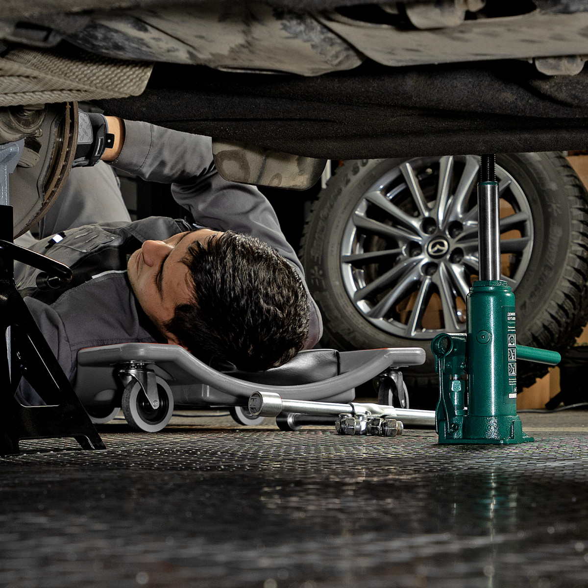 • Удобное хранение и транспортировка — домкрат весит всего 2,2 кг и поставляется в прочном пластиковом кейсе с рукояткой.