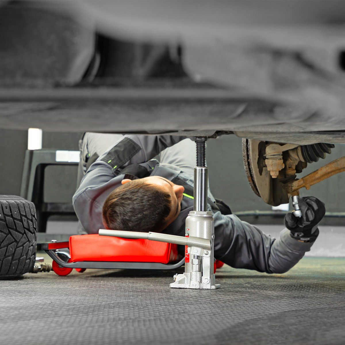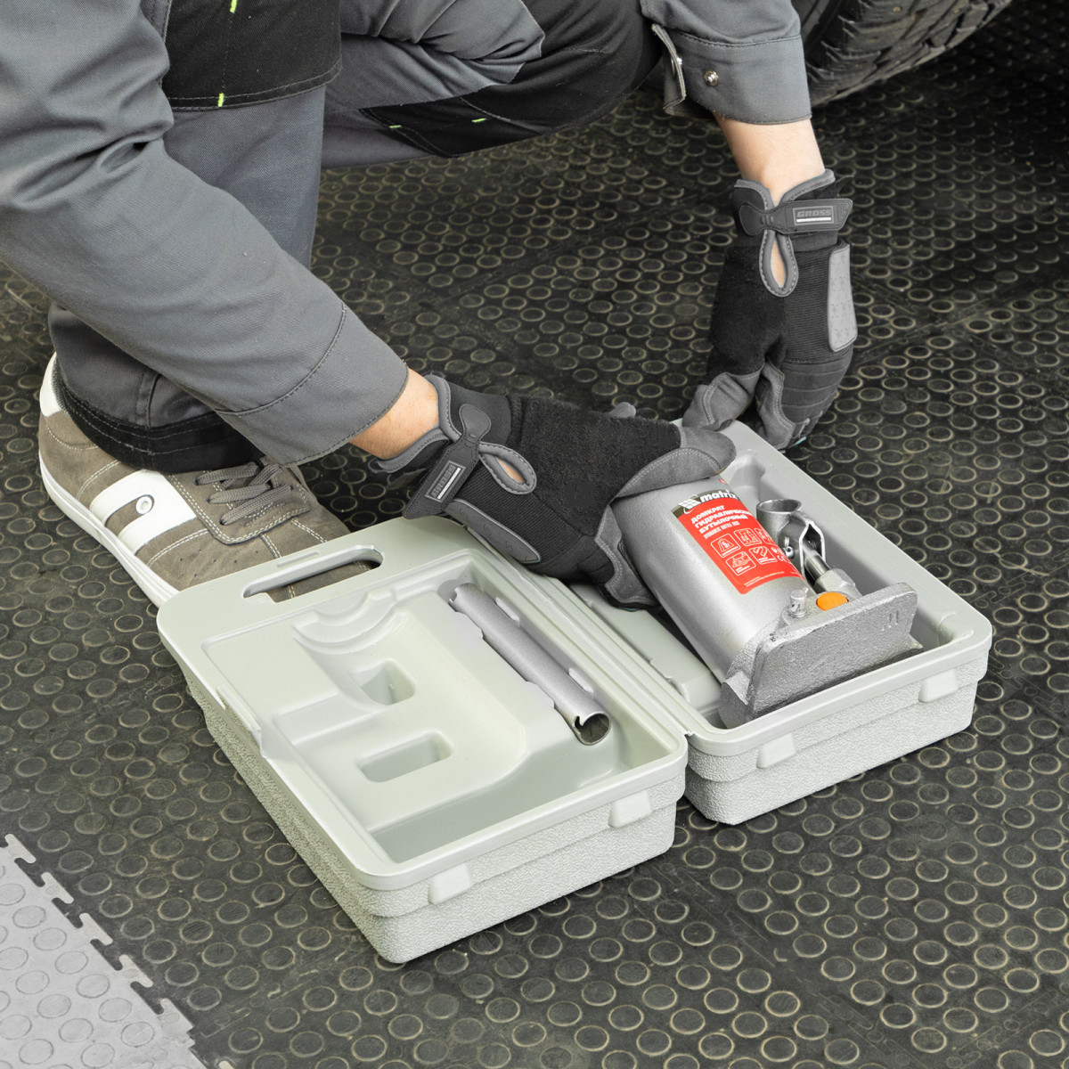 • Удобная транспортировка — домкрат комплектуется прочным пластиковым кейсом.