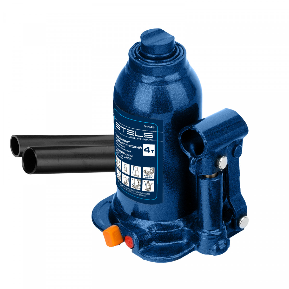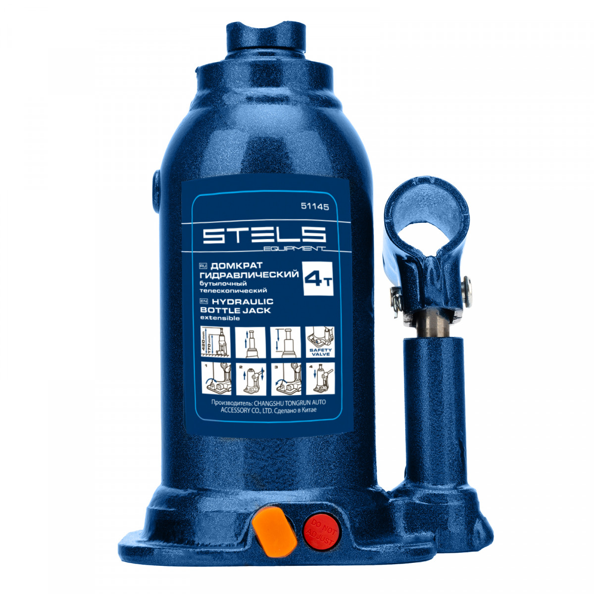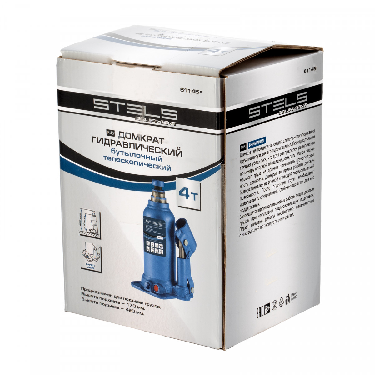 Гидравлический бутылочный телескопический домкрат Stels 51145 используется для поднятия грузов весом до 4 т с на высоту 170-420 мм. Не требует больших усилий и оптимален для автомобилей с большим клиренсом. Домкрат можно использовать в гараже для самостоятельного ремонта машины или в автосервисе для решения профессиональных задач.