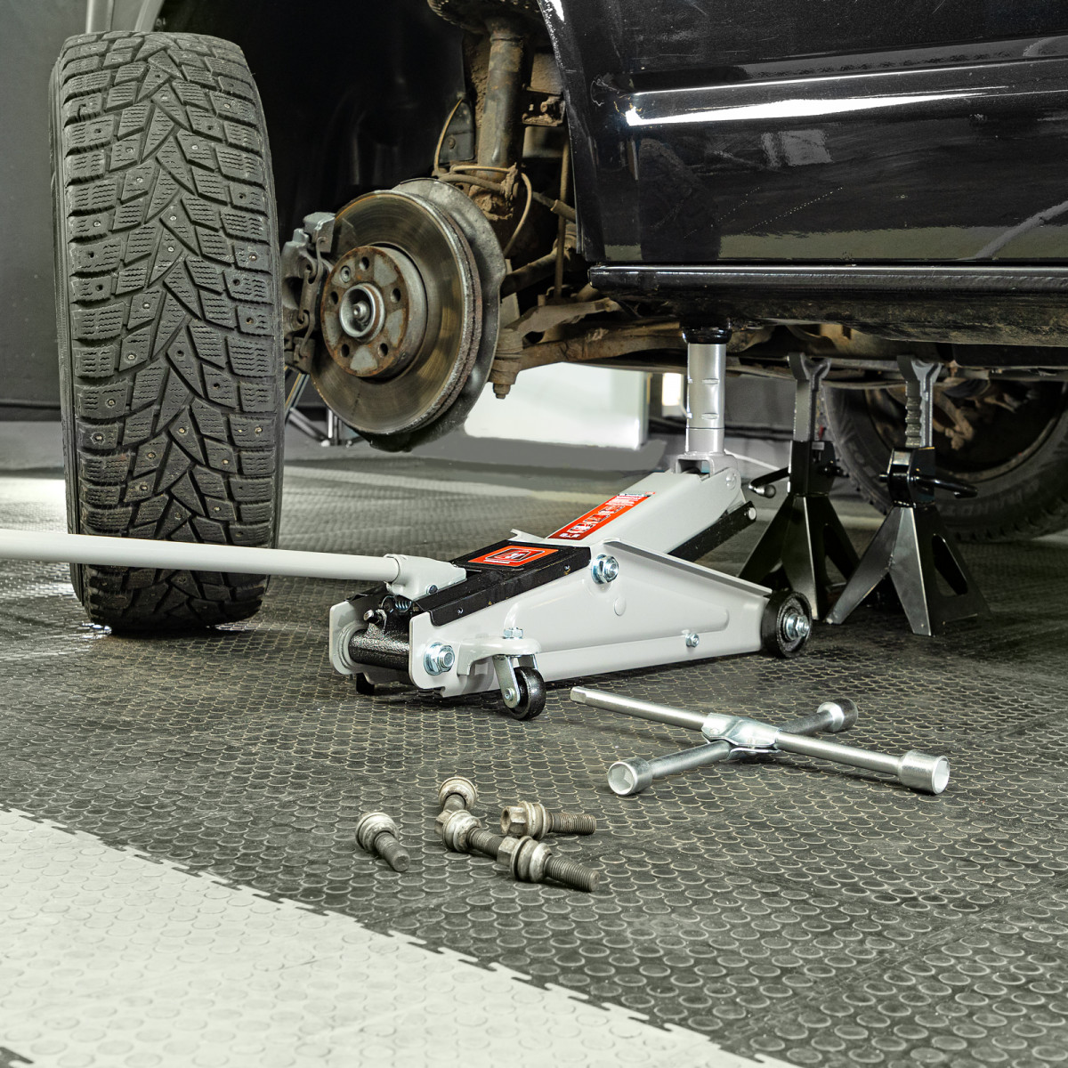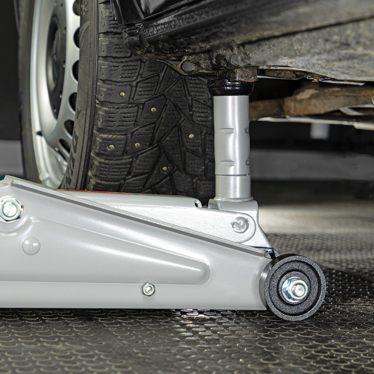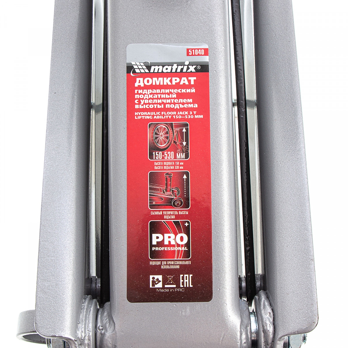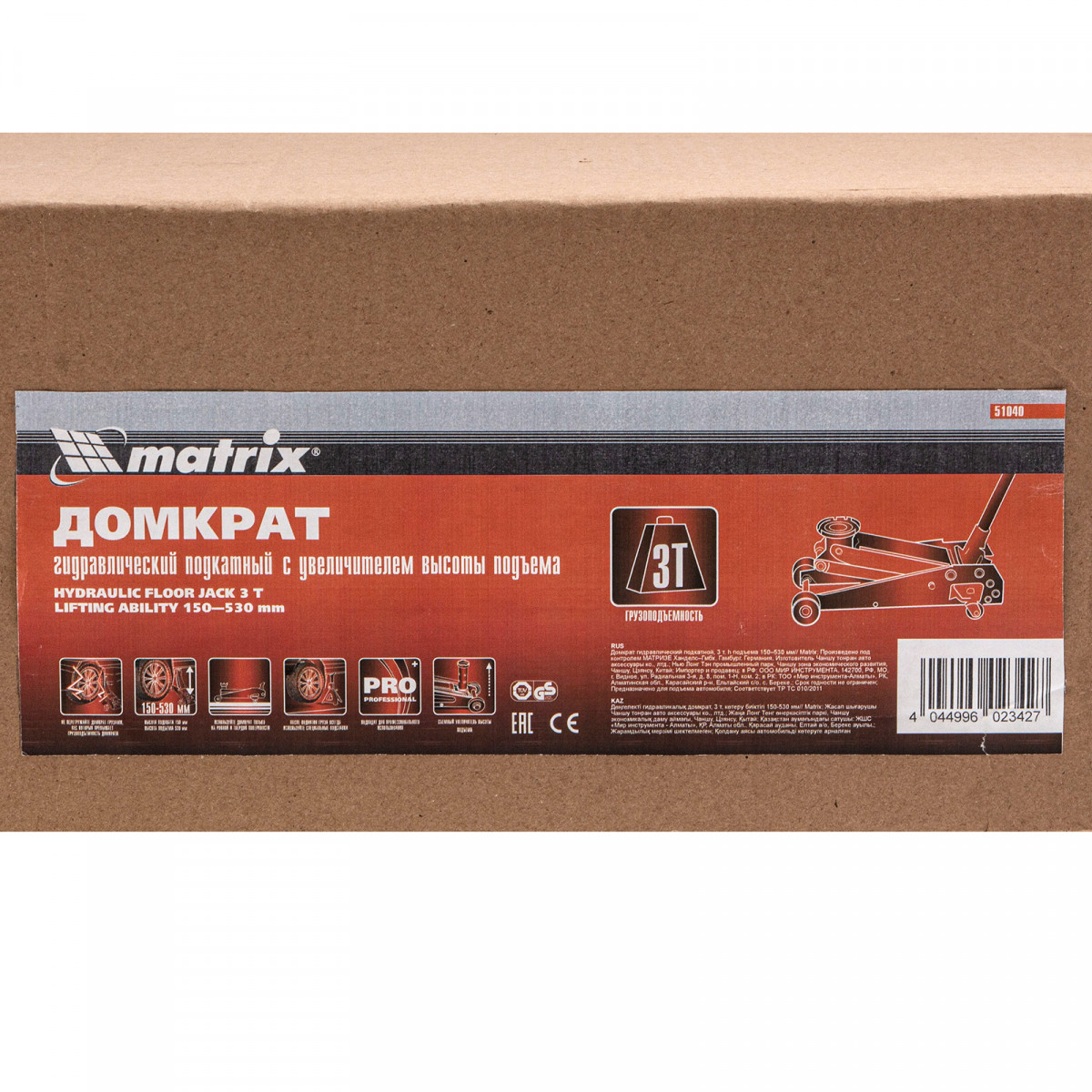 Подкатной гидравлический домкрат Matrix 51040 с высотой подхвата 150 мм, — полупрофессиональное гаражное оборудование, способное поднимать груз массой до 3 т на высоту до 530 мм. Высота подхвата 150 мм позволяет использовать домкрат для автомашин с высоким клиренсом. Домкрат будет полезен как в автомастерской, так и в частном гараже.