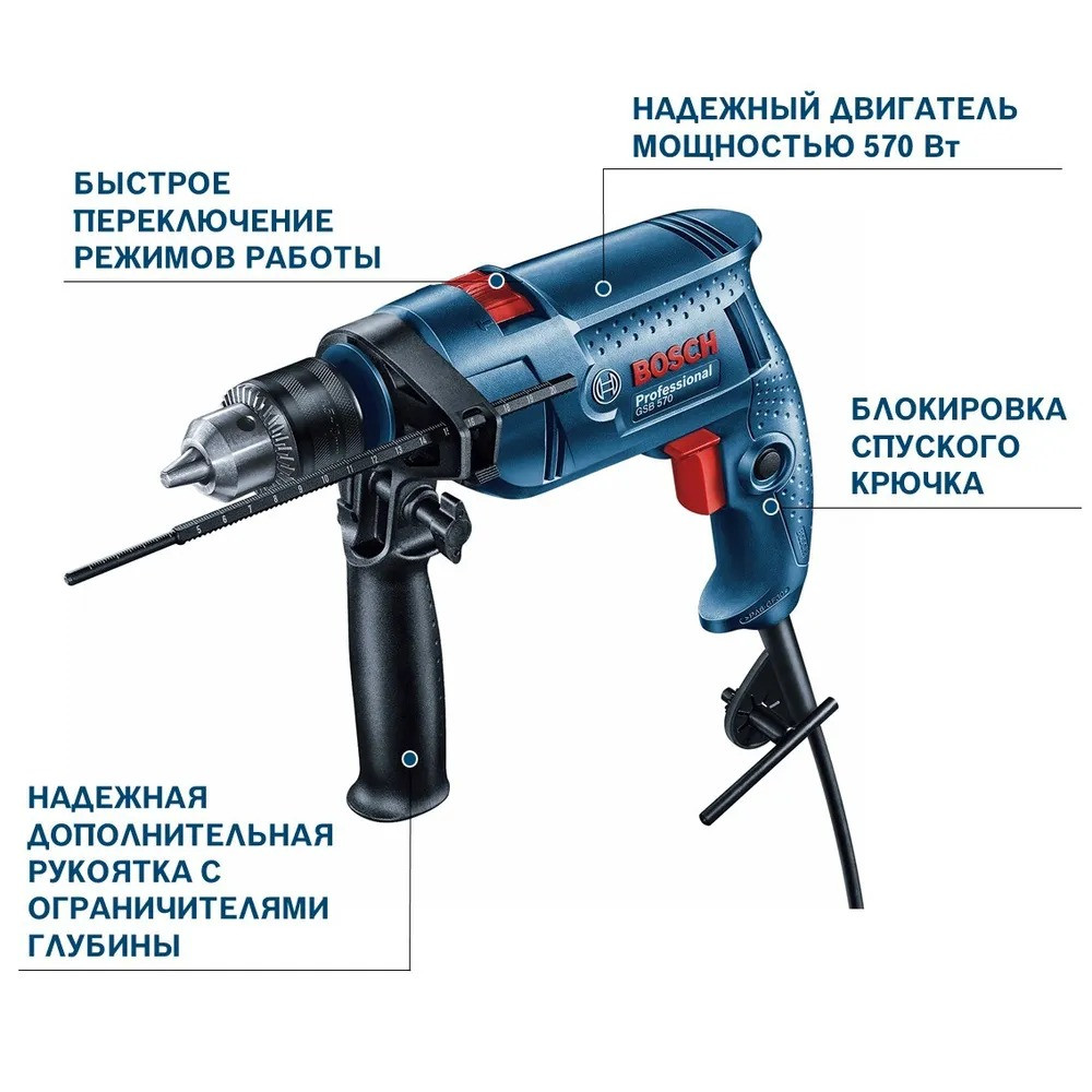 Дрель Bosch GSB 570 - эффективный и практичный в использовании ударный инструмент с мощностью 570 Вт, максимальное число оборотов холостого хода 3000 об/мин. Функция удара для работы с твердыми поверхностями. Частота ударов 48000 уд/мин. Патрон ключевой для надежной фиксации оснастки. Реверс позволяет быстро освободить застрявшее в материале сверло. Максимальный диаметр сверления по дереву 25 мм, максимальный диаметр сверления по металлу 10 мм, в кирпиче 10 мм. Боковая рукоять с нескользящей поверхностью для крепкого удержания при интенсивных и длительных нагрузках. Вес товара 1,7 кг.