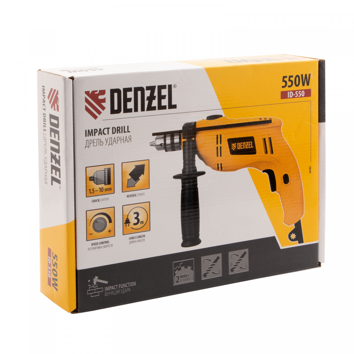 Ударная дрель Denzel ID-550 26302 мощностью 550 Вт поддерживает скорость вращения оснастки 0-2900 об/мин и частоту ударов 46400 уд/мин. Используется для ручного или ударного сверления металла, древесины, легкого бетона, кирпича, плитки или пластика. Сверлит отверстия диаметром до 20 мм в древесине, до 10 мм в бетоне и до 10 мм в металле. Эффективное сверление твердых материалов обеспечивает массивный промщит ударного механизма. Дрель работает со сверлами с диаметром хвостовика 1,5-10 мм, что позволяет эффективно решать различные задачи.