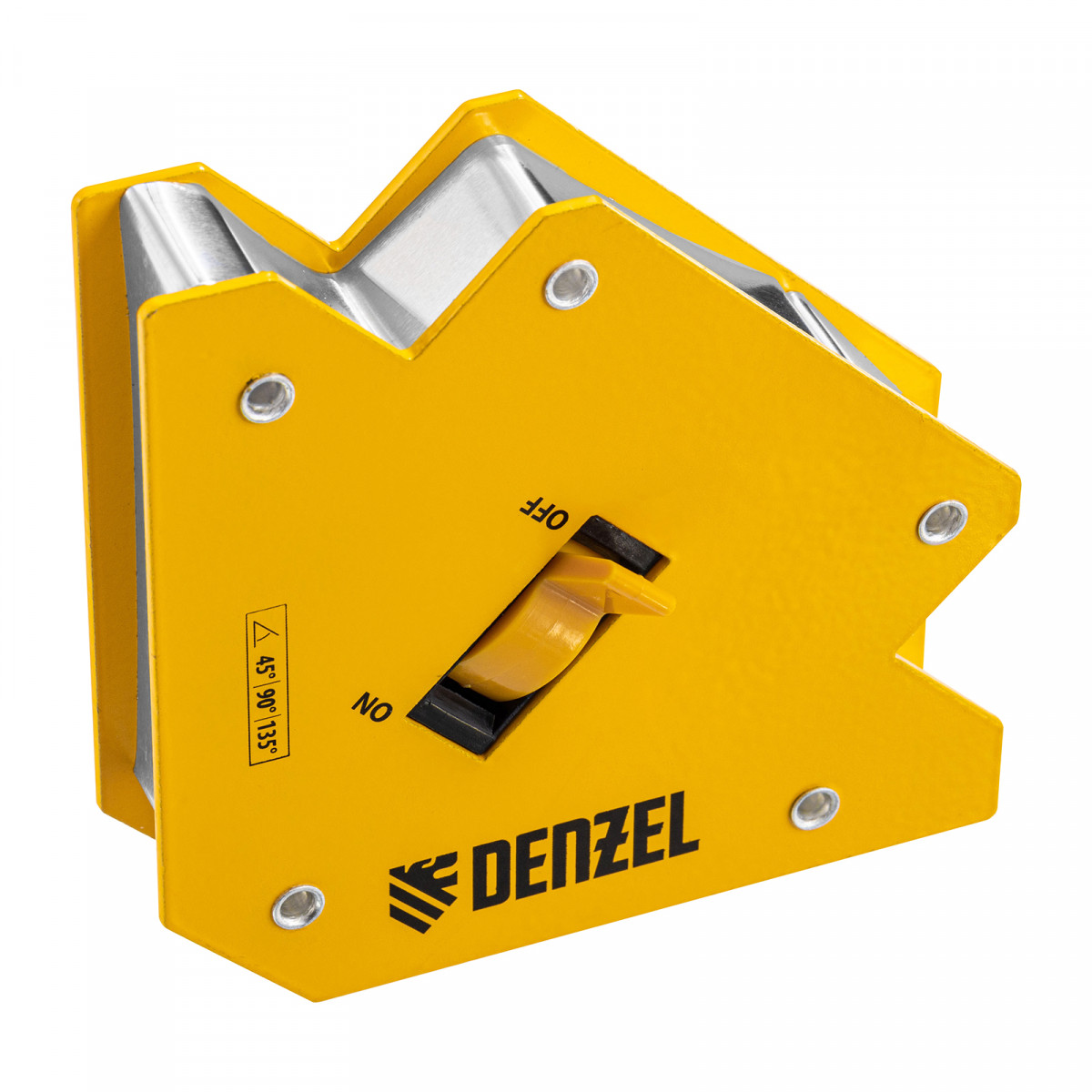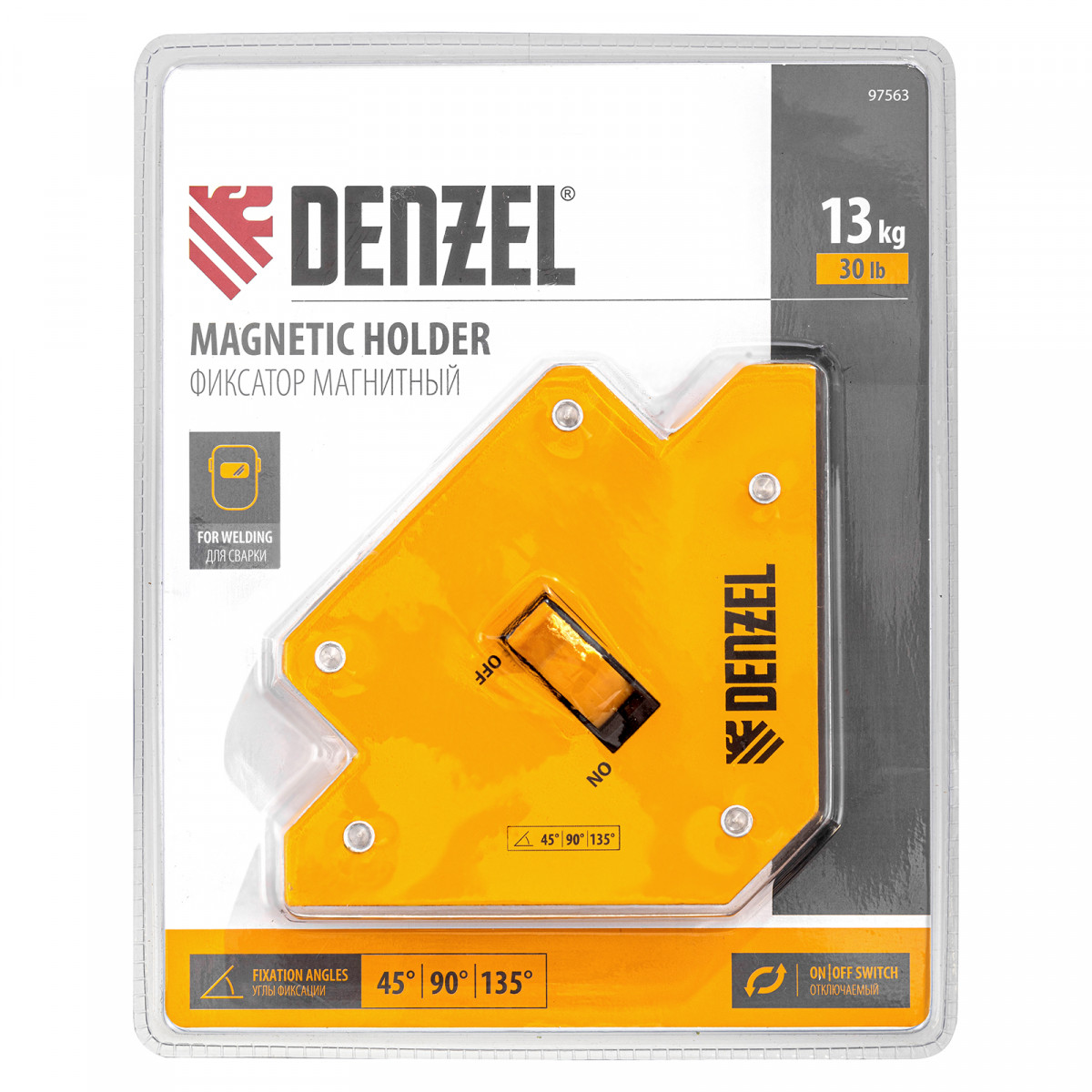 Фиксатор магнитный отключаемый для сварочных работ Denzel 97563 выдерживает усилие 30 LB (14 кг) и способен удерживать металлические предметы под углом 45°, 90°, 135°. Применяется при пайке, сварке, монтаже уголков, труб, профилей и других конструкций. Магнитное поле при необходимости отключается, что упрощает установку фиксатора и его снятие.
