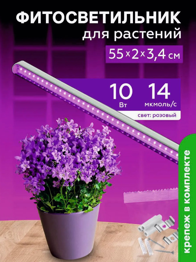 Фитосветильник светодиодный 10Вт спектр для фотосинтеза 572 мм Урожайная сотка с выкл розовый свет