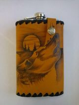 Фляжка из нержавеющей стали, со съемным чехлом из натуральной кожи, с художественным оформлением.
