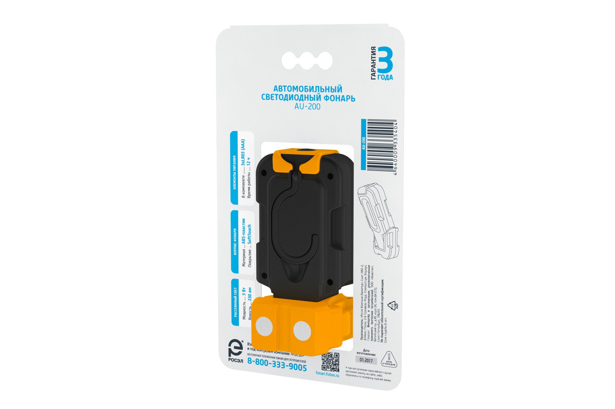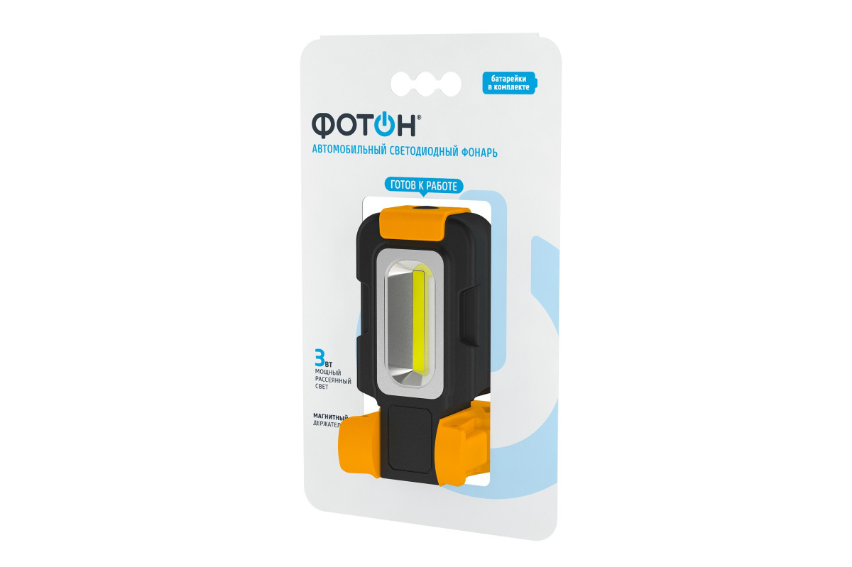 – Материал корпуса – ABS-пластик– Покрытие – SoftTouch – Рассеянный свет – мощный светодиод 3W– Магнитный держатель– Регулируемый угол наклона– Крюк для подвешивания– Питание – 3*LR03 (AAA) – Выключатель - кнопочный, торцевой, рез. кнопка– В комплекте – батарейки ФОТОН 3*LR03 (AAA)