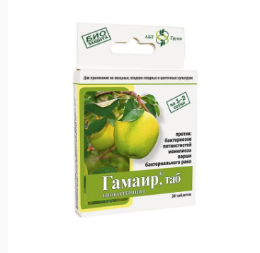 Гамаир, таб - биологический бактерицид и фунгицид на основе полезной природной бактерии Bacillus subtilis М – 22 ВИЗР, предотвращающий развитие пятнистостей на листьях, бактериальных гнилей, парши, монилиоза, бактериального рака, сосудистого и слизистого бактериозов.