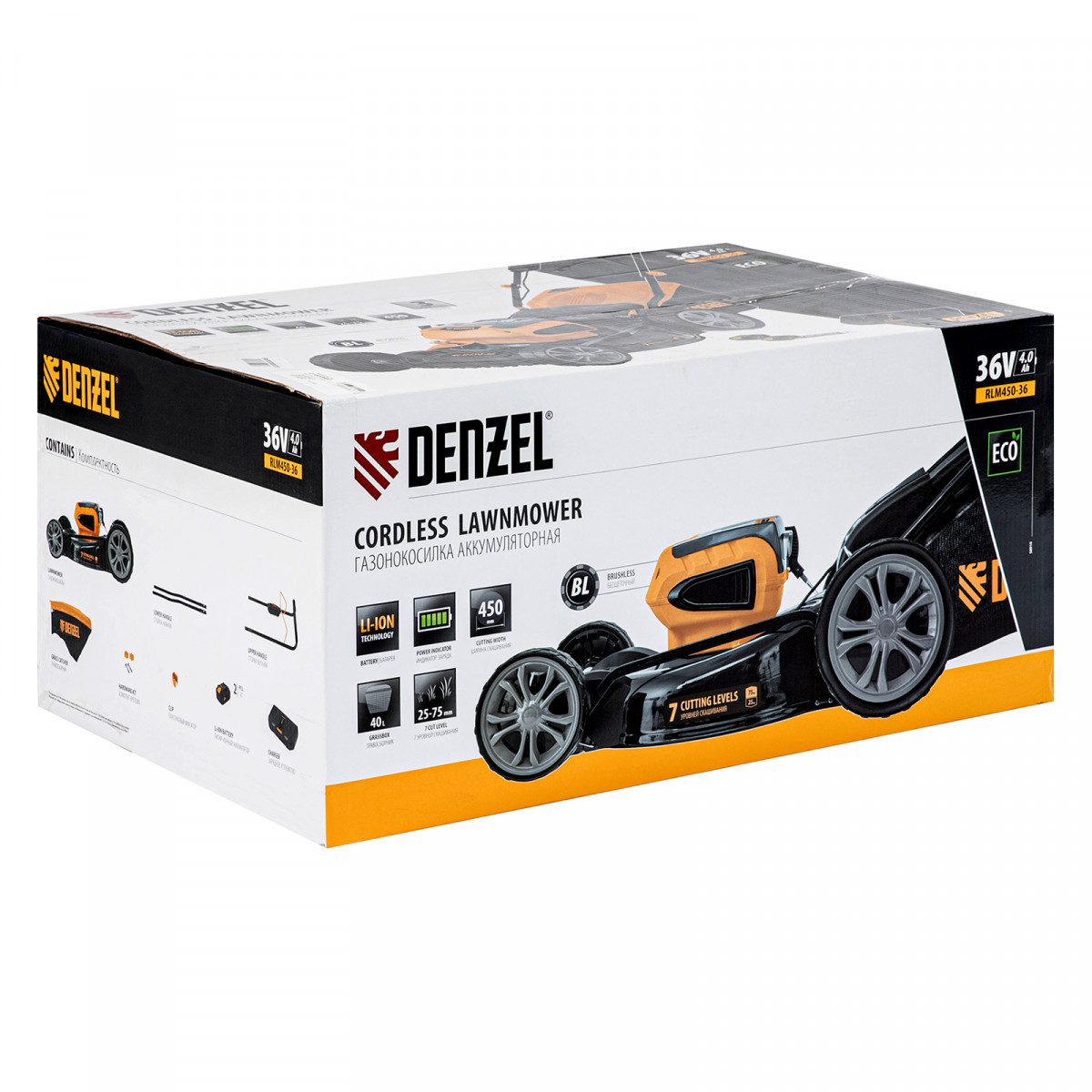 Газонокосилка аккумуляторная бесщеточная RLM450-36, Li-ion, 36 В, 4 Ач, 450 мм, травосборник 40 л Denzel