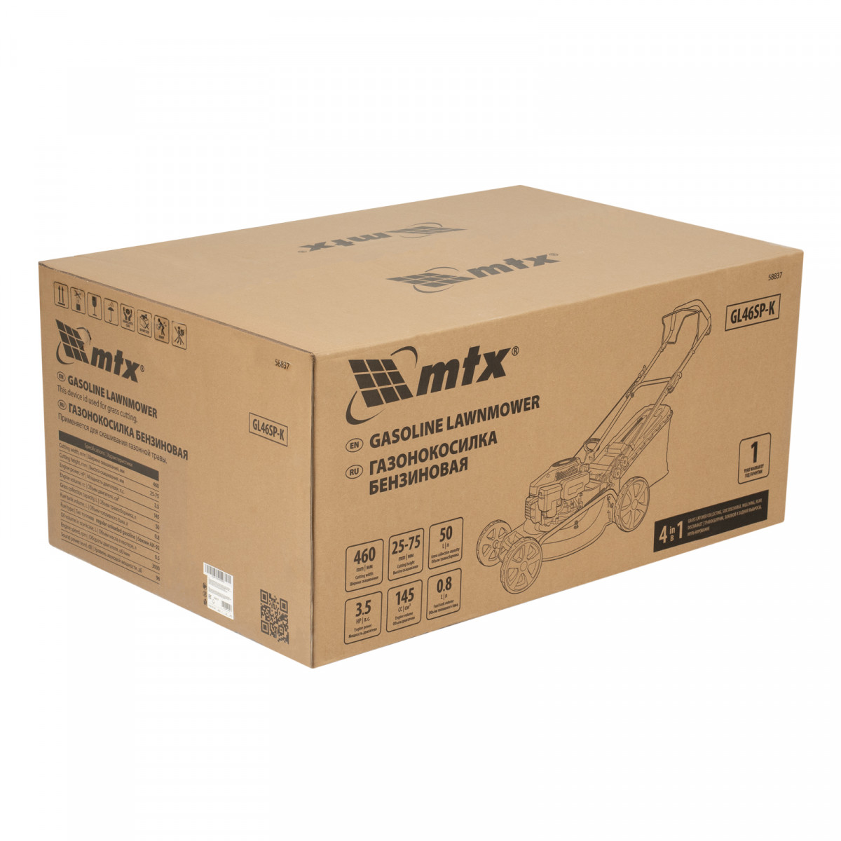 Бензиновая газонокосилка MTX GL46SP-K 58837 с двигателем объемом 145 см³, приводом на колеса и травосборником объемом 50 л обеспечивает ширину скашивания 46 см. Предназначена для кошения травы на газонах и лужайках, оптимальна для ухода за приусадебным участком небольшой площади. Высота скашивания регулируется в диапазоне 25-75 мм (предусмотрено 7 уровней) — можно привести в порядок спортивную площадку, лужайку для отдыха и т.д. Четырехтактный двигатель мощностью 3,5 л.с. позволяет эффективно решать поставленные задачи.