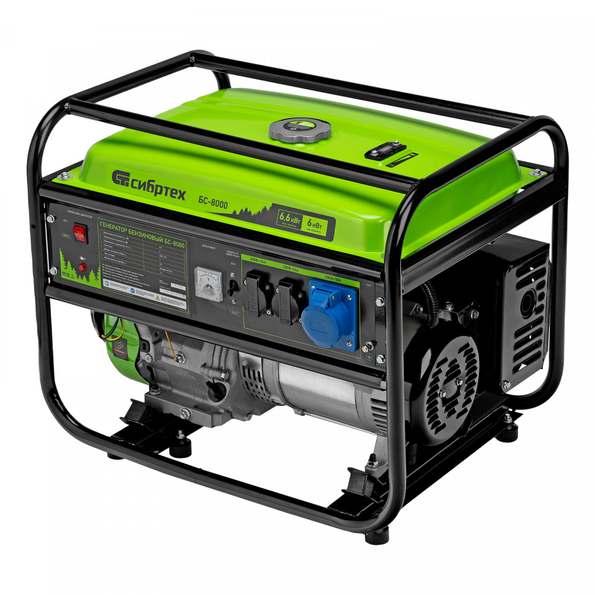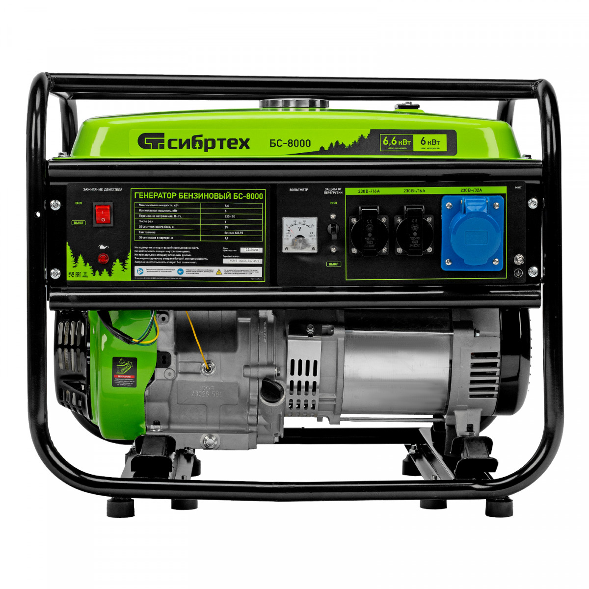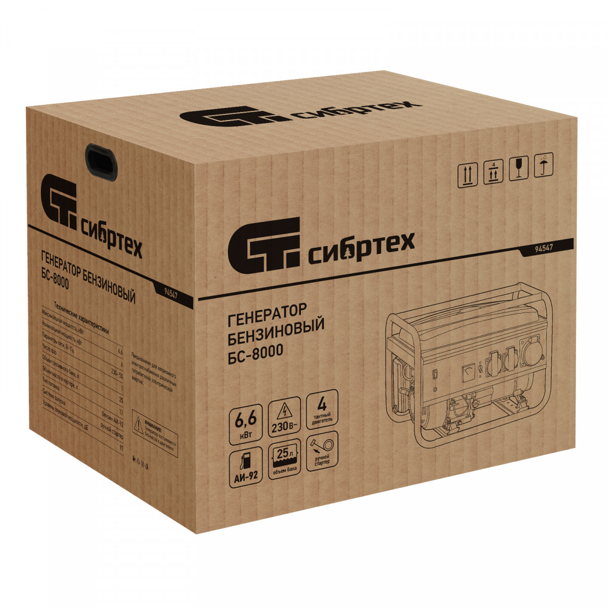 Генератор бензиновый БС-8000, 6,6 кВт, 230В, четырехтактный, 25 л, ручной стартер Сибртех