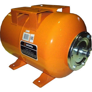 Гидроаккумулятор ГА-24 Вихрь рекомендуется использовать со скважинными (до 500 Вт) или поверхностными насосами мощностью до 1 кВт. Гидроаккумулятор выступает в роли накопителя воды, а также отвечает за поддержание нужного давления воды и компенсирует его перепады в системе водоснабжения. Если такой прибор установлен, то насос включается не каждый раз при открытии крана, что значительно повышает его ресурс. Корпус и фланец агрегата выполнены из стали, что обеспечивает ему надежность и защиту от коррозии, сменная мембрана - из пищевой резины. Необходимая модель гидроаккумулятора выбирается в зависимости от мощности и объема потребляемой воды насосом