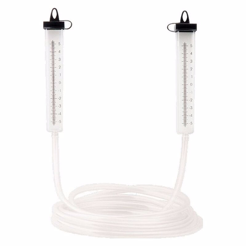 Достаточно широкое применение получил гидроуровень, также известный как строительный водяной уровень. По своему устройству он представляет собой обычный шланг, длина которого может составлять от 5 до 25 метров, а на его концах располагаются две колбы, на которые нанесена шкала. Эти колбы оборудованы специальными крышками, через которые в шланг наливается вода. Водяной строительный уровень может быть использован исключительно для того, чтобы определить степень точности поверхностей. Среди преимуществ его использования следует выделить достаточно простую и понятную схему эксплуатации, длину и низкую стоимость.