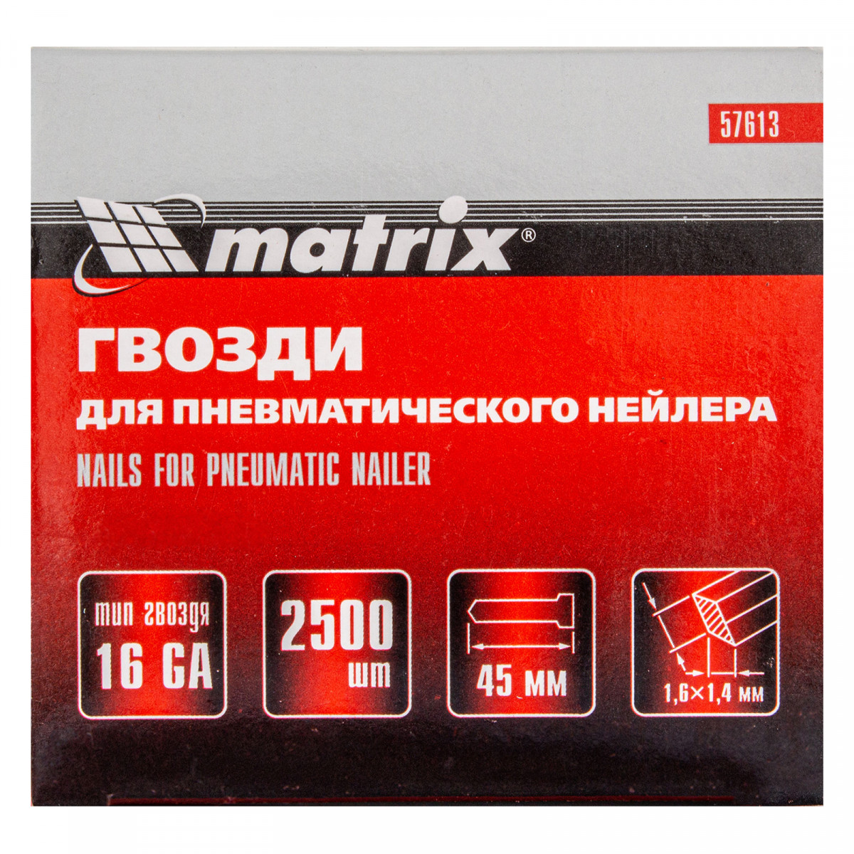 Гвозди для пневматического нейлера 16GA, сечение 1.6 х 1.4, длина 45 мм, 2500 шт Matrix