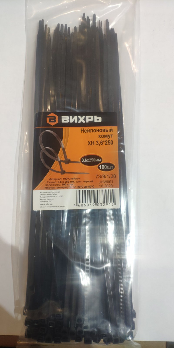 Хомут нейлоновый 3,6*200 черный (100шт) Вихрь