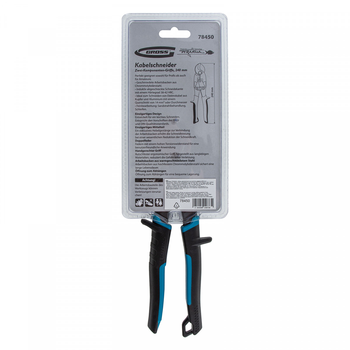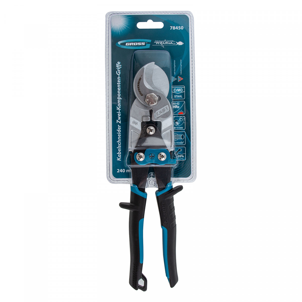 Кабелерез Gross «PIRANHA» 78450 длиной 240 мм, с двухкомпонентными рукоятками, используется для перерезания одножильных и многожильных кабелей диаметром до 14 мм и сечением до 14 кв. мм. Он пригодится частным мастерам и профессионалам при выполнении электромонтажных работ.