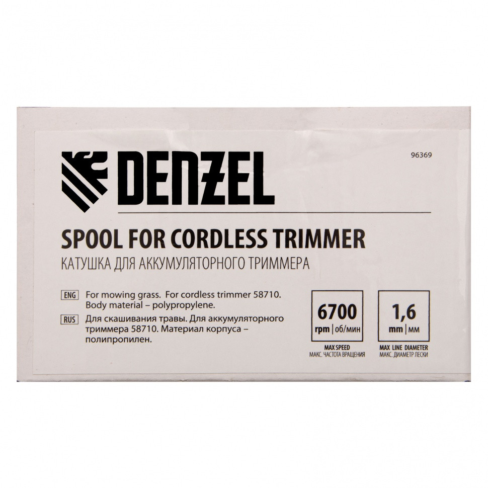 Катушка Denzel 96369 предназначена для аккумуляторного триммера Denzel RT300-36 58710. Заправляется леской толщиной до 1,6 мм, обеспечивает ширину скашивания 30 см, используется для срезания молодой травы и обработки границ газона.