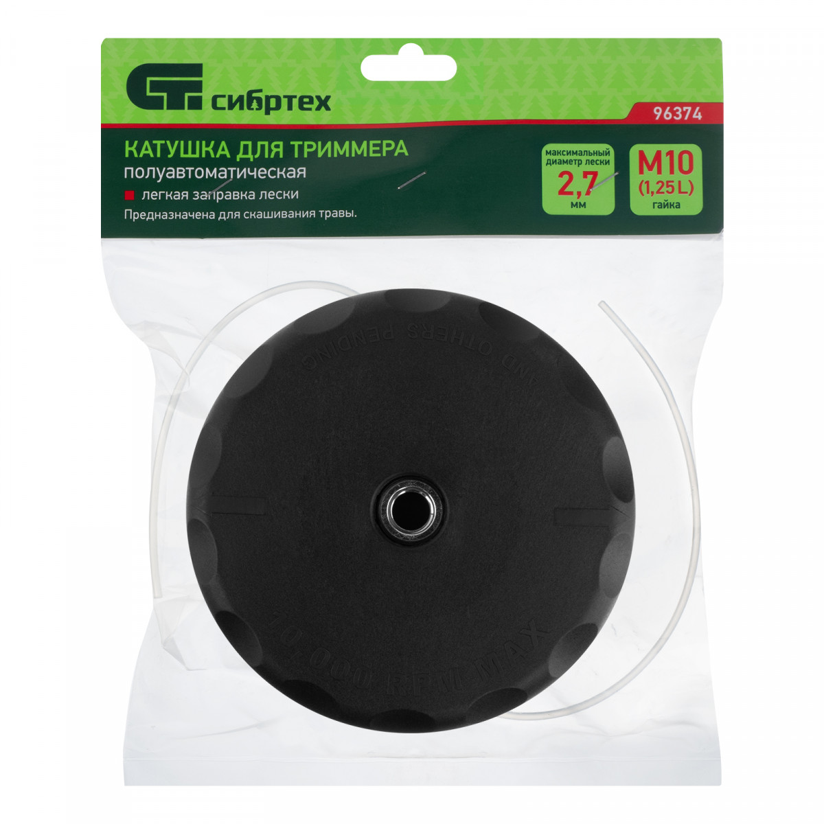 Полуавтоматическая катушка Сибртех 96374 с легкой заправкой лески крепится на вал бензинового или электрического триммера при помощи гайки М10 х 1,25 мм с левой резьбой. Заправляется леской диаметром до 2,7 мм, что позволяет использовать ее для подравнивания газона и скашивания сорняков. Катушка пригодится владельцам загородных участков.